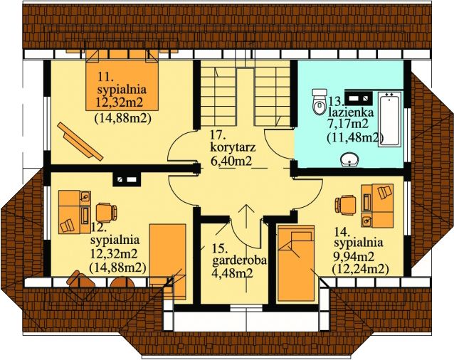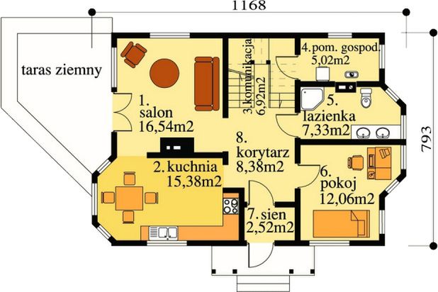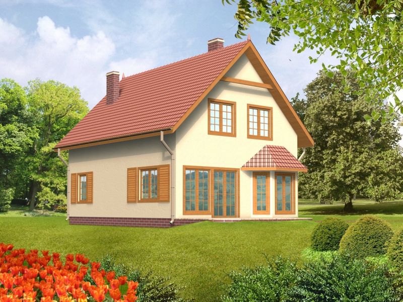 Graficzne opracowanie rzutów poglądowych widocznych na karcie projektu zostało wykonane przez Extradom.pl. Prezentowane przez Extradom.pl wizualizacje wykonane zostały przez autora projektu i należy poczytywać je jedynie za przykład i propozycję wykończenia, wizję architektoniczną autora projektu. Ostateczne wykończenie budynku może nastąpić na wiele sposobów. Szczegółowe rozwiązania zastosowane w oferowanej dokumentacji - w tym również ilość, lokalizacje i wygląd okien, drzwi, kominów - mogą w niewielkim stopniu różnić się od prezentowanej wizualizacji budynku.