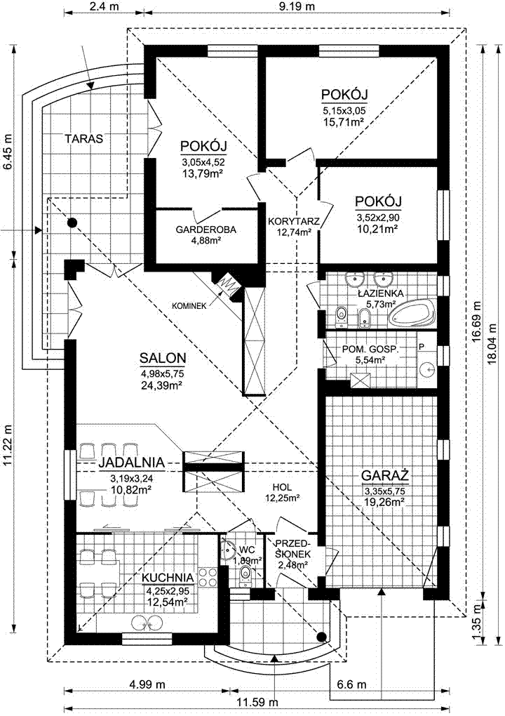 Graficzne opracowanie rzutów poglądowych widocznych na karcie projektu zostało wykonane przez Extradom.pl. Prezentowane przez Extradom.pl wizualizacje wykonane zostały przez autora projektu i należy poczytywać je jedynie za przykład i propozycję wykończenia, wizję architektoniczną autora projektu. Ostateczne wykończenie budynku może nastąpić na wiele sposobów. Szczegółowe rozwiązania zastosowane w oferowanej dokumentacji - w tym również ilość, lokalizacje i wygląd okien, drzwi, kominów - mogą w niewielkim stopniu różnić się od prezentowanej wizualizacji budynku.