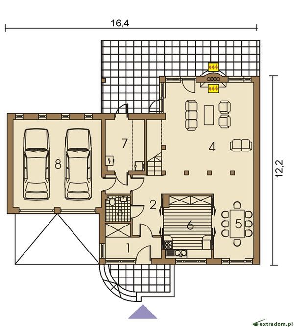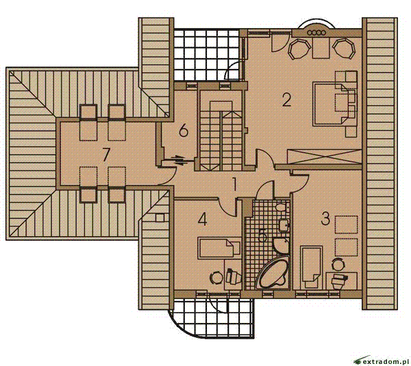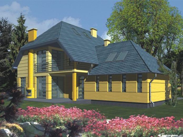 Graficzne opracowanie rzutów poglądowych widocznych na karcie projektu zostało wykonane przez Extradom.pl. Prezentowane przez Extradom.pl wizualizacje wykonane zostały przez autora projektu i należy poczytywać je jedynie za przykład i propozycję wykończenia, wizję architektoniczną autora projektu. Ostateczne wykończenie budynku może nastąpić na wiele sposobów. Szczegółowe rozwiązania zastosowane w oferowanej dokumentacji - w tym również ilość, lokalizacje i wygląd okien, drzwi, kominów - mogą w niewielkim stopniu różnić się od prezentowanej wizualizacji budynku.
