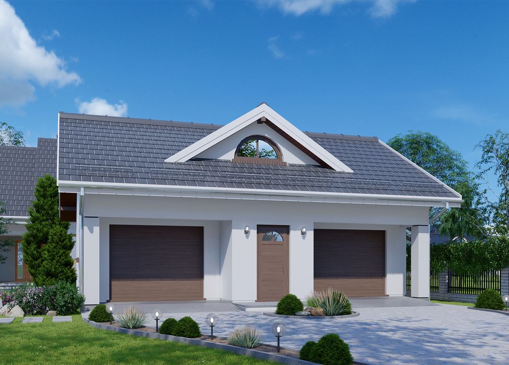 Graficzne opracowanie rzutów poglądowych widocznych na karcie projektu zostało wykonane przez Extradom.pl. Prezentowane przez Extradom.pl wizualizacje wykonane zostały przez autora projektu i należy poczytywać je jedynie za przykład i propozycję wykończenia, wizję architektoniczną autora projektu. Ostateczne wykończenie budynku może nastąpić na wiele sposobów. Szczegółowe rozwiązania zastosowane w oferowanej dokumentacji - w tym również ilość, lokalizacje i wygląd okien, drzwi, kominów - mogą w niewielkim stopniu różnić się od prezentowanej wizualizacji budynku.