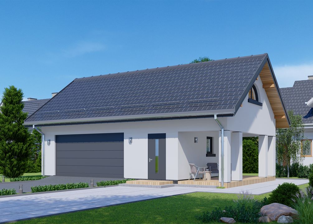 Graficzne opracowanie rzutów poglądowych widocznych na karcie projektu zostało wykonane przez Extradom.pl. Prezentowane przez Extradom.pl wizualizacje wykonane zostały przez autora projektu i należy poczytywać je jedynie za przykład i propozycję wykończenia, wizję architektoniczną autora projektu. Ostateczne wykończenie budynku może nastąpić na wiele sposobów. Szczegółowe rozwiązania zastosowane w oferowanej dokumentacji - w tym również ilość, lokalizacje i wygląd okien, drzwi, kominów - mogą w niewielkim stopniu różnić się od prezentowanej wizualizacji budynku.