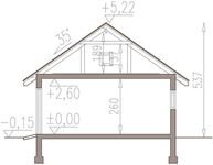 Ściany: bloczek gazobetonowy 24 cm, tynk. Strop: płyty GK podwieszane do pasa dolnego wiązara dachowego. Dach: dwuspadowy, więźba tradycyjna, drewniana, kąt nachylenia 35 stopni ocieplenie stropu: wełna mineralna ISOVER Uni Mata.