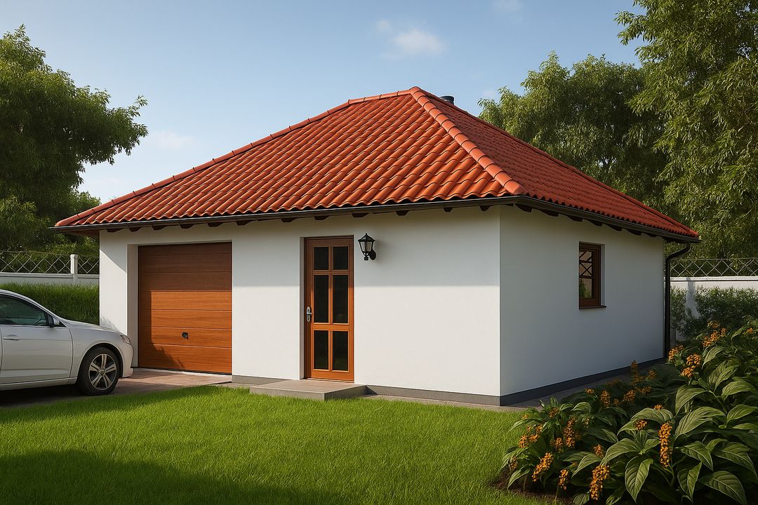 Budynek wykonany w technologii tradycyjnej. Ściany murowane z bloczków z betonu komórkowego grubości 24cm i 12cm. Brama o wymiarach 2,40×2,20m. Więźba dachowa czterospadowa, drewniana, pokryta blachodachówką.