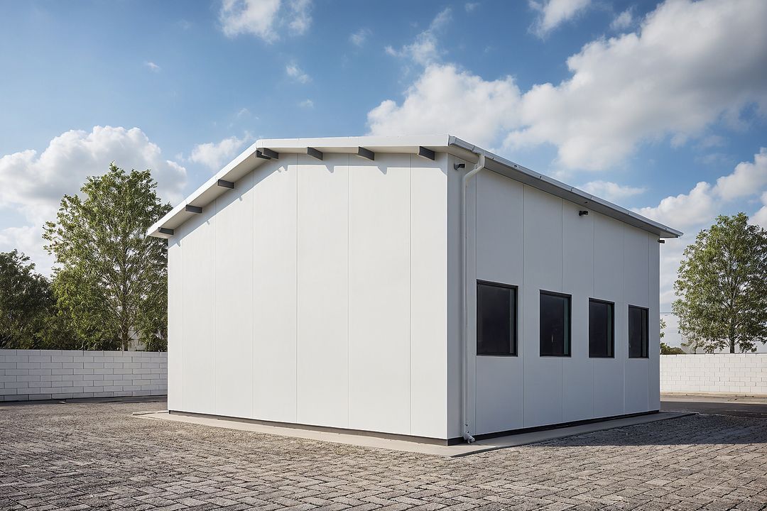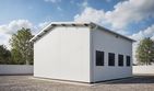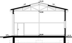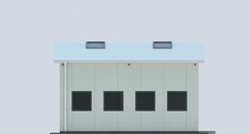 Budynek konstrukcji stalowej. Ściany z płyty warstwowej. Bramy o wymiarach 3,00×3,50m. Więźba dachowa dwuspadowa, stalowa, pokryta płytą warstwową. Dodatkowe doświetlenia garażu poprzez cztery świetliki w połaci dachu.
