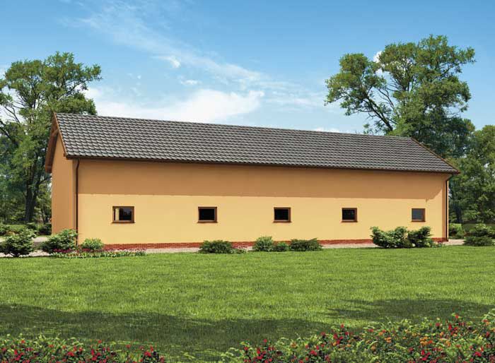 Ściany zewnętrzne nośne murowane grubości 25 cm. Wszystkie ściany wykonane pustaków ceramicznych. Więźba dachowa drewniana. Pokrycie dachu dachówka cementowa bądź ceramiczna. wymiar bram garażowych 1x 3,5x3,8 m, 3x 3,5x3,5 m, 1x 2,5x3,5 m.