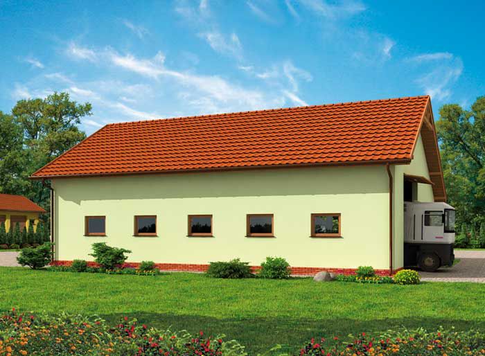 Ściany zewnętrzne nośne murowane grubości 25 cm. Wszystkie ściany wykonane z pustaków ceramicznych. Więźba dachowa drewniana. Pokrycie dachu dachówka ceramiczna. Wymiary bram garażowych 2x 4,2x4,0 m i 2x 3,0x3,0 m.