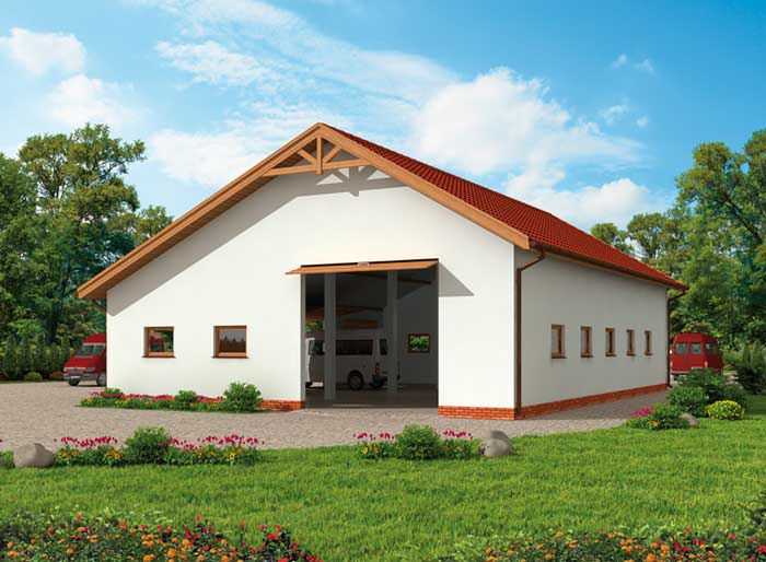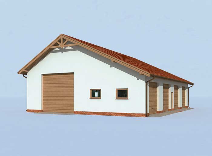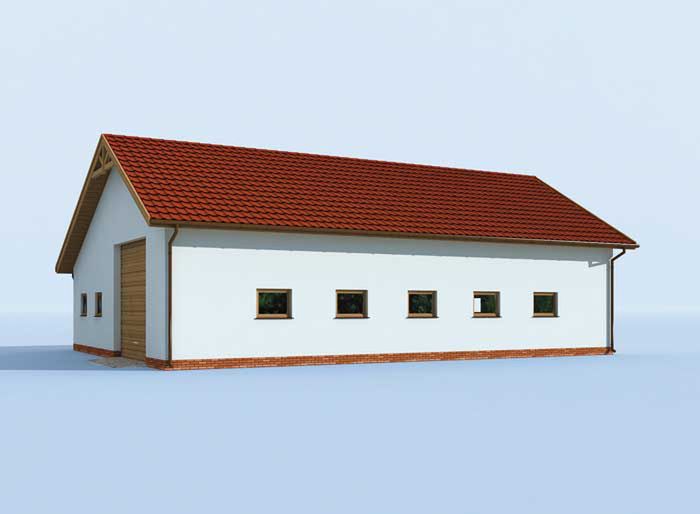 Ściany zewnętrzne nośne murowane grubości 25 cm. Wszystkie ściany wykonane z pustaków ceramicznych. Więźba dachowa drewniana. Pokrycie dachu dachówka ceramiczna. wymiary bram garażowych 2x 4,2x4,0 m i 4x 3,0x3,0 m.