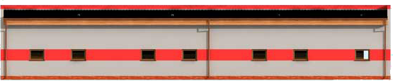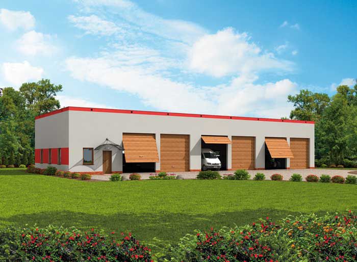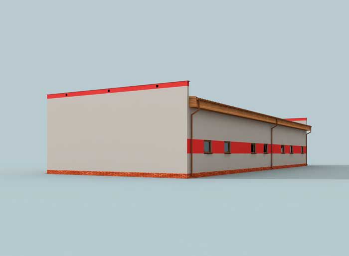 Technologia tradycyjna :- powierzchnia użytkowa -345,10m2 - powierzchnia zabudowy -372,60m2 - powierzchnia całkowita -372,60m2 - kubatura -1990,00m3- ściany zewnętrzne nośne murowane grubości 25cm - wszystkie ściany wykonane z pustaków ceramicznych "POROTHERM" - wysokość budynku 5,98m - dach jednospadowy 3° - więźba dachowa drewniana - pokrycie dachu papa termozgrzewalna - wymiar bram garażowych 3,5x3,8m