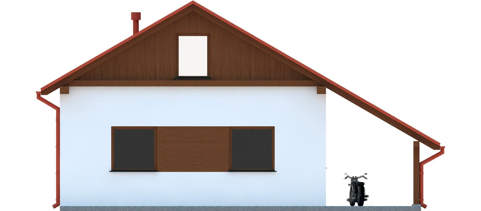Graficzne opracowanie rzutów poglądowych widocznych na karcie projektu zostało wykonane przez Extradom.pl. Prezentowane przez Extradom.pl wizualizacje wykonane zostały przez autora projektu i należy poczytywać je jedynie za przykład i propozycję wykończenia, wizję architektoniczną autora projektu. Ostateczne wykończenie budynku może nastąpić na wiele sposobów. Szczegółowe rozwiązania zastosowane w oferowanej dokumentacji - w tym również ilość, lokalizacje i wygląd okien, drzwi, kominów - mogą w niewielkim stopniu różnić się od prezentowanej wizualizacji budynku.
