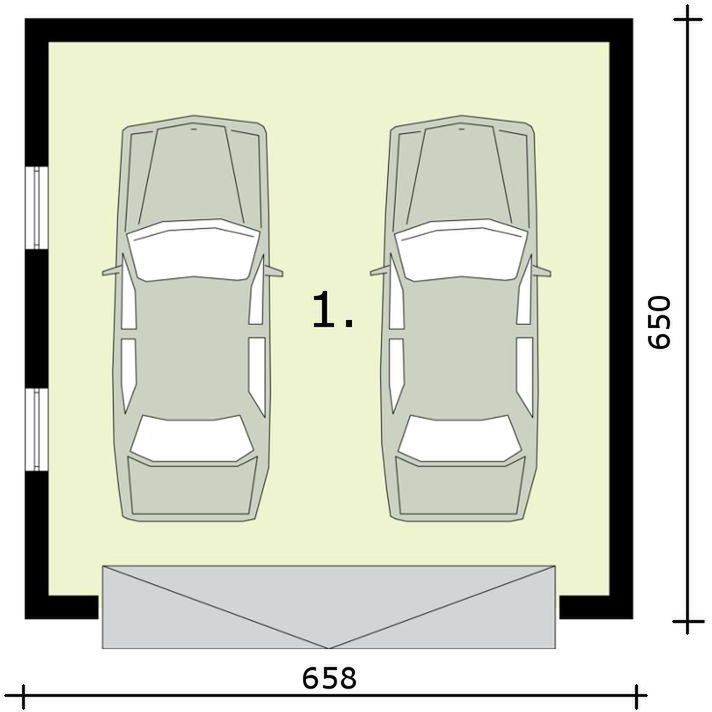 Technologia tradycyjna :- powierzchnia użytkowa -36,12m2 - powierzchnia zabudowy -42,77m2 - powierzchnia całkowita -42,77m2 - kubatura - 145,10m3 - ściany zewnętrzne nośne murowane grubości 25cm - wszystkie ściany wykonane z pustaków ceramicznych "POROTHERM" - wysokość budynku 3,8m - dach jednospadowy 3° - więźba dachowa drewniana - pokrycie dachu papa - wymiar bramy garażowej 5,0x2,2m