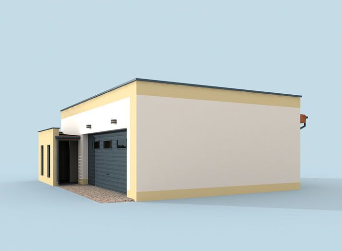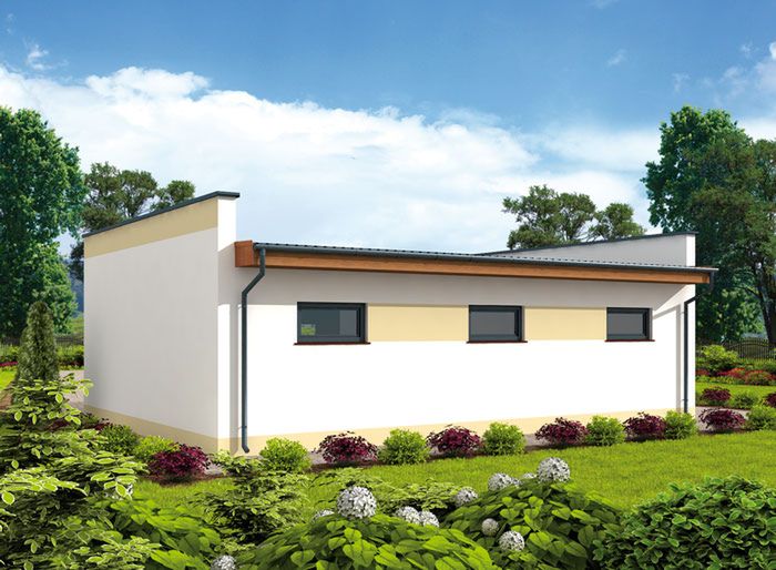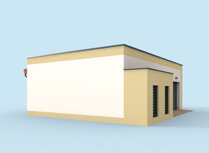Technologia tradycyjna :- powierzchnia użytkowa -61,00m2 - powierzchnia zabudowy -73,25m2 - powierzchnia całkowita -73,25m2 - kubatura części przekrytej i zamkniętej ze wszystkich stron -209,41m3- kubatura części przekrytej i nie zamkniętej ze wszystkich stron -25,75m3- kubatura razem -235,16m3 - ściany zewnętrzne nośne murowane grubości 25cm - wszystkie ściany wykonane z pustaków ceramicznych "POROTHERM" - wysokość budynku 3,70m - dach jednospadowy 3° - więźba dachowa drewniana - pokrycie dachu papa - wymiar bramy garażowej 5,0x2,2m
