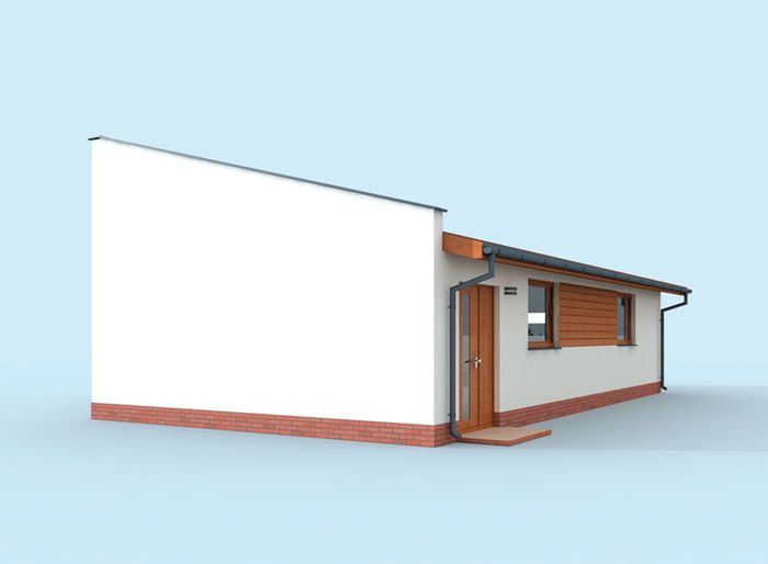 Technologia tradycyjna :- powierzchnia użytkowa -74,66m2 - powierzchnia zabudowy -86,45m2 - powierzchnia całkowita -86,45m2 - kubatura - 355,00m3 - ściany zewnętrzne nośne murowane grubości 25cm - wszystkie ściany wykonane z pustaków ceramicznych "POROTHERM" - wysokość budynku 5,27m - dach jednospadowy 15° - więźba dachowa drewniana - pokrycie dachu stalowe panele drewniane - wymiar bramy garażowej 5,0x2,4m