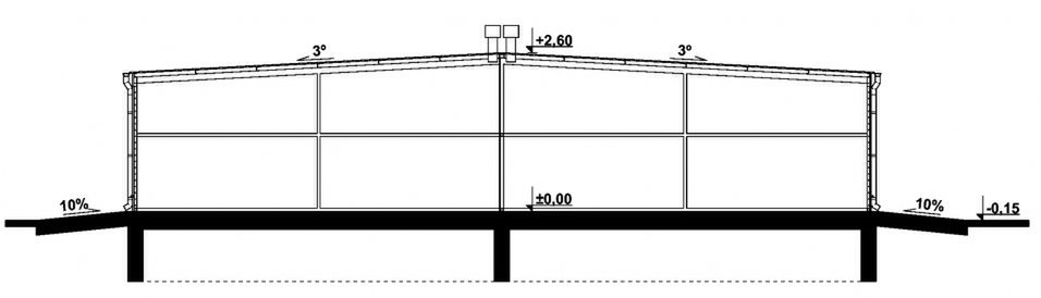 Budynek konstrukcji stalowej. Ściany z blachy trapezowej „T-18”. Bramy o wymiarach 2,50×2,20m. Więźba dachowa dwuspadowa, stalowa, pokryta blachą trapezową.