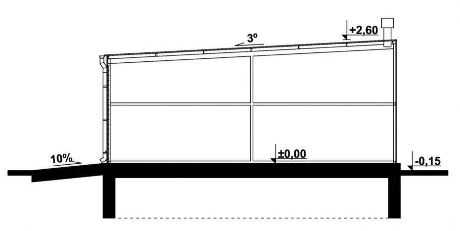 Budynek konstrukcji stalowej. Ściany z blachy trapezowej „T-18”. Bramy o wymiarach 2,50×2,20m. Więźba dachowa dwuspadowa, stalowa, pokryta blachą trapezową.
