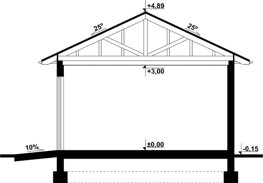 Budynek wykonany w technologii tradycyjnej. Ściany murowane z bloczków z betonu komórkowego grubości 24cm. Bramy o wymiarach 2,60×2,60m. Więźba dachowa dwuspadowa, drewniana, pokryta blachą trapezową.