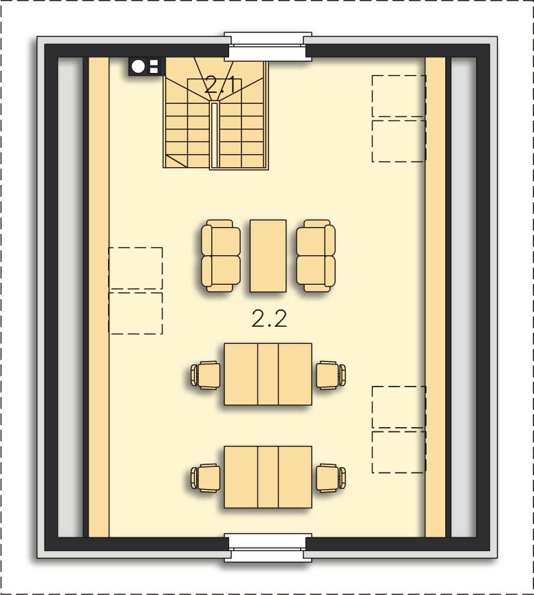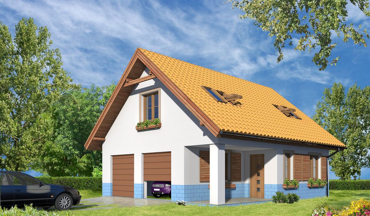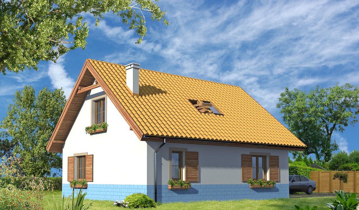 Graficzne opracowanie rzutów poglądowych widocznych na karcie projektu zostało wykonane przez Extradom.pl. Prezentowane przez Extradom.pl wizualizacje wykonane zostały przez autora projektu i należy poczytywać je jedynie za przykład i propozycję wykończenia, wizję architektoniczną autora projektu. Ostateczne wykończenie budynku może nastąpić na wiele sposobów. Szczegółowe rozwiązania zastosowane w oferowanej dokumentacji - w tym również ilość, lokalizacje i wygląd okien, drzwi, kominów - mogą w niewielkim stopniu różnić się od prezentowanej wizualizacji budynku.