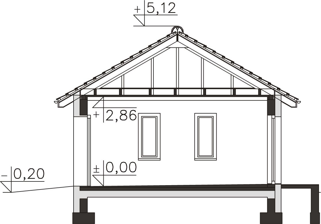 Fundamenty - tradycyjne. Ściany zewnętrzne - Bloczek silikatowy 24 cm + styropian 20 cm. Strop - drewniany. Dach - tradycyjna więźba ciesielska. Wentylacja - grawitacyjna.