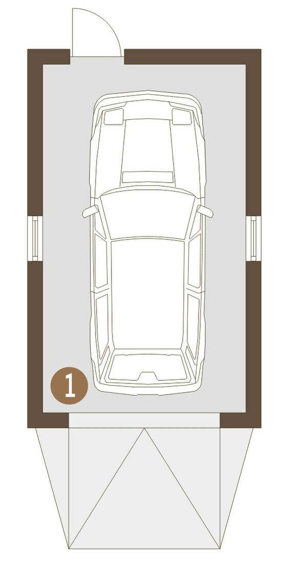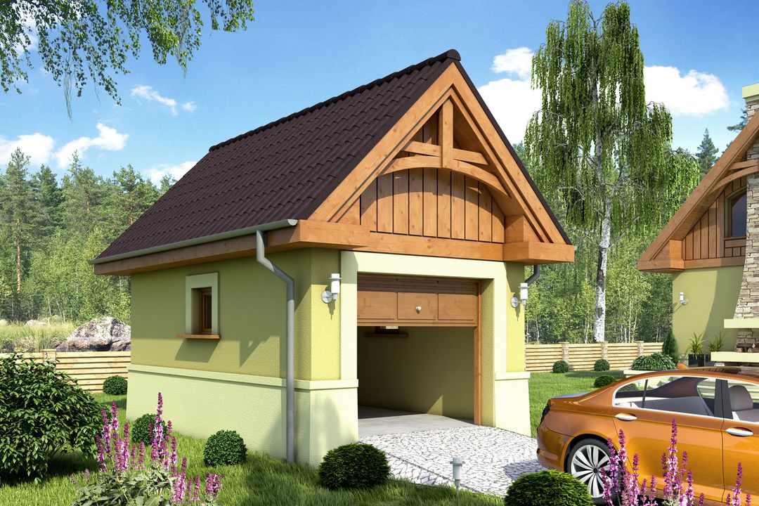 Ściany w technologii murowanej z pustaków ceramicznych z dachem o konstrukcji drewnianej pokrytym dachówką ceramiczną lub cementową.Wysokość użytkowa 2,5 cm. Brama wjazdowa zaprojektowano jako podnoszoną o wym. 2,5 m x 2,2 m. Wykończenia: elewacje - tynk akrylowy. Podmurówka - tynk mozaikowy.