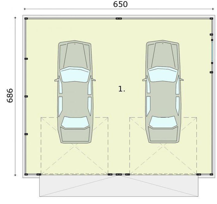 Technologia tradycyjna :- powierzchnia użytkowa -46,26m2 - powierzchnia zabudowy -44,59m2 - powierzchnia całkowita -44,59m2 - kubatura - 134,11m3 - wysokość budynku 3,60m - dach dwuspadowy 20° --budynek zaprojektowano w technologii szkieletu stalowego - pokrycie dachu z blachy trapezowej- wymiar bram garażowych 2500x2125.
