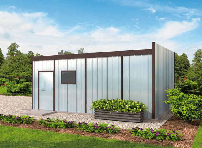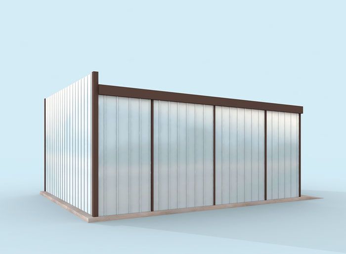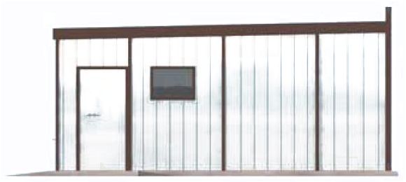 Budynek zaprojektowano w technologii szkieletu stalowego. Pokrycie dachu z blachy trapezowej. Wymiar bramy garażowej 4,0 x 2,125 m.