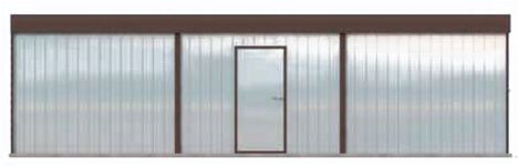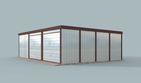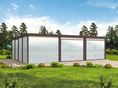 Budynek zaprojektowano w technologii szkieletu stalowego. Pokrycie dachu z blachy trapezowej. Wymiar bram garażowych 2400 x 2125 mm.