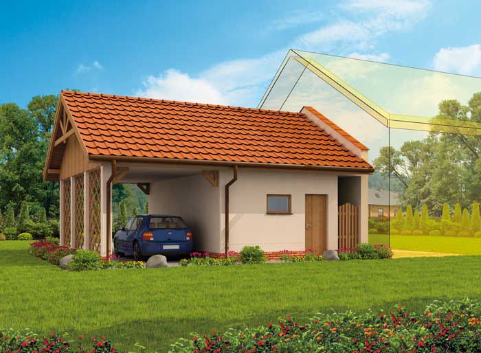 GP10 garaż dostawiany jednostanowiskowy z pomieszczeniem gospodarczym i wiatą SLN1498