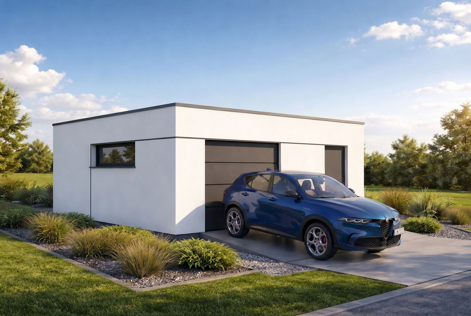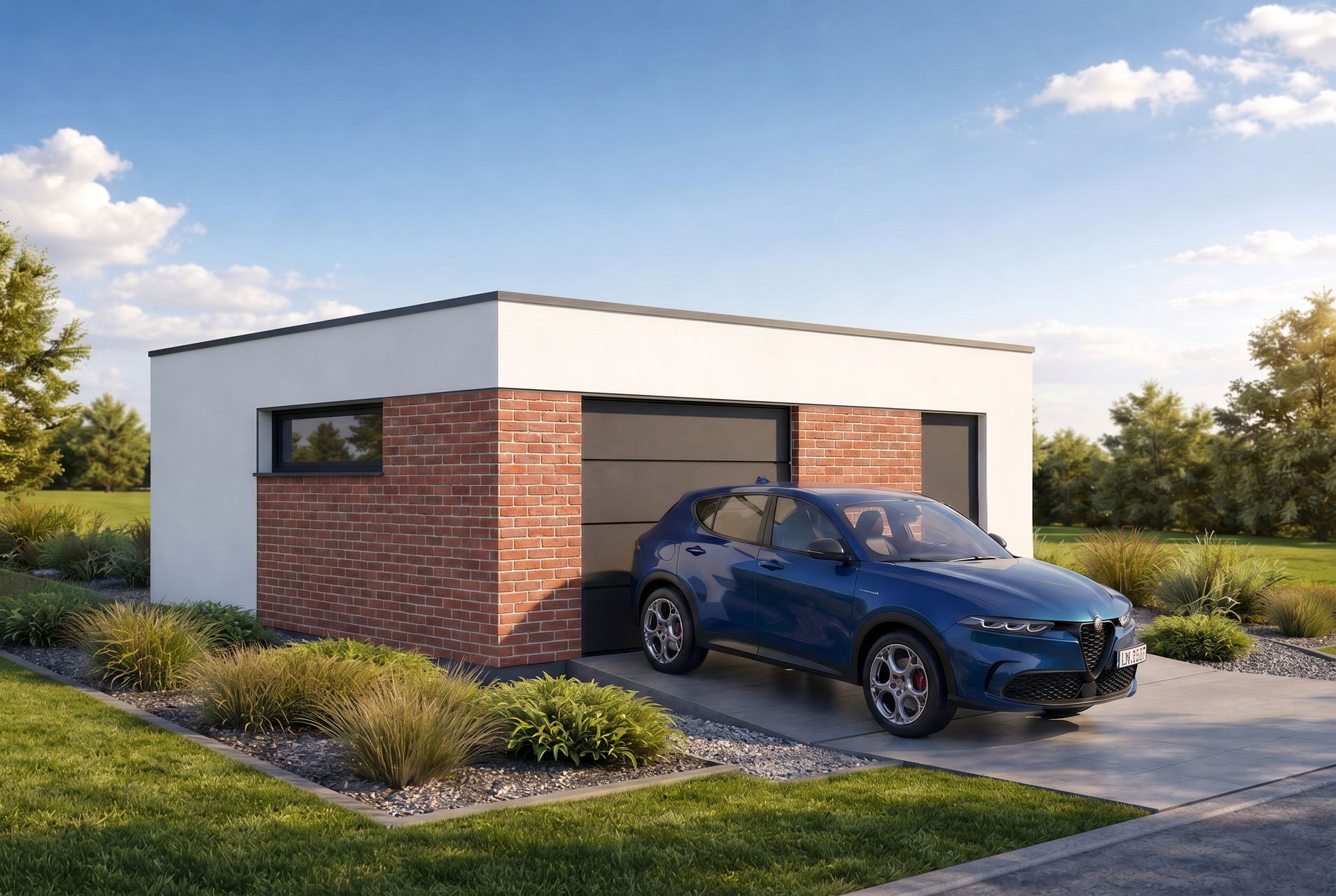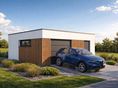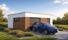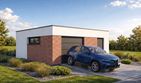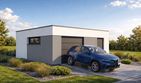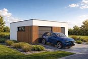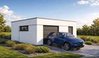 Garaż wolnostojący Imola 1.5 to projekt garażu jednostanowiskowego powiększonego o funkcjonalną strefę dodatkową. Obiekt oferuje jedno komfortowe miejsce postojowe oraz znaczną przestrzeń do przechowywania lub urządzenia warsztatu wewnątrz jednej bryły. Nowoczesny stropodach oraz brak tradycyjnej więźby dachowej sprawiają, że budynek cechuje się niską, nienachalną sylwetką, która idealnie komponuje się z współczesną architekturą domów mieszkalnych.