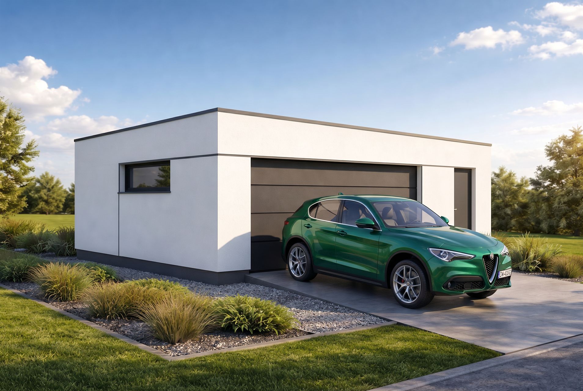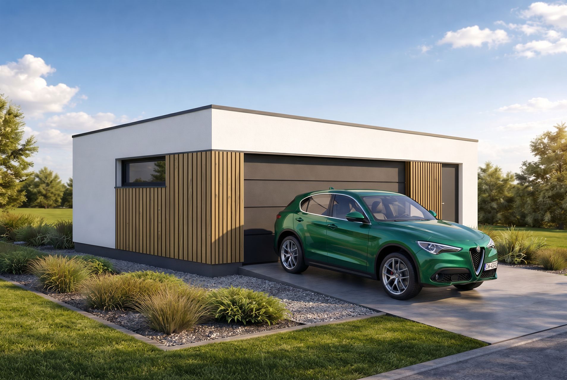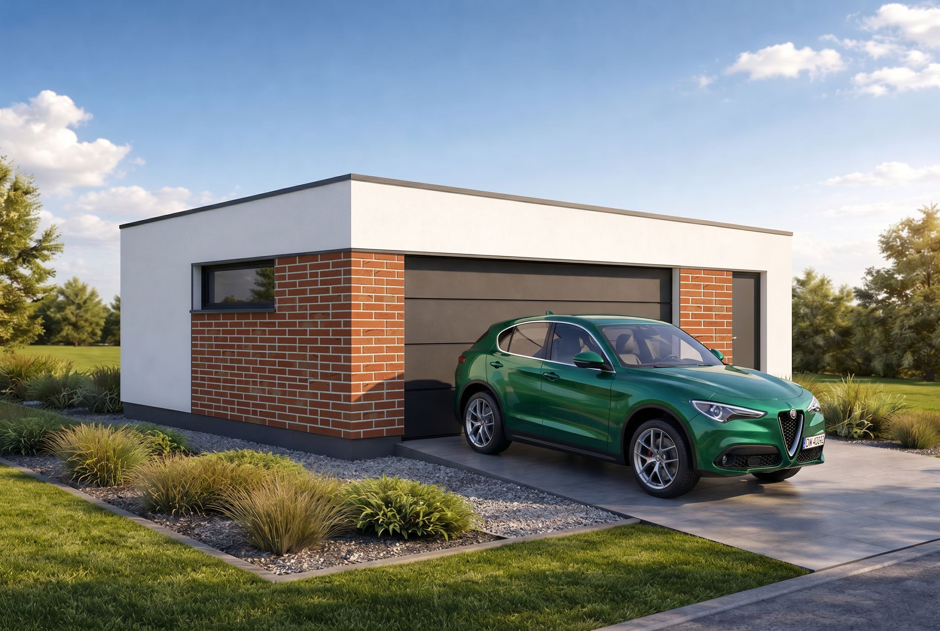 Projekt garażu z dachem płaskim w systemie IMOLA to propozycja dla inwestorów ceniących nowoczesny design. Niska, nienachalna bryła sprawia, że budynek łatwo wkomponować w otoczenie, nawet obok domów z dachem dwu- lub czterospadowym. Elewacja w standardzie wykończona jest białym tynkiem, jednak wizualizacja prezentuje atrakcyjne możliwości dekoracyjne, takie jak zastosowanie wstawek z tynku o kontrastowym kolorze lub modnych lameli.