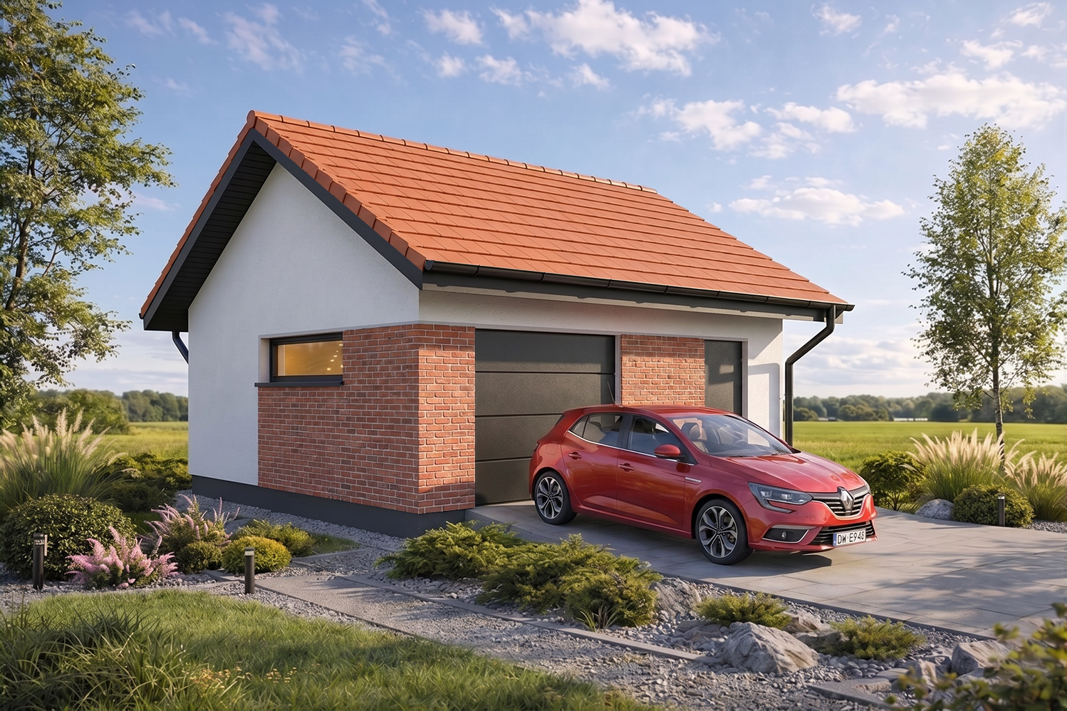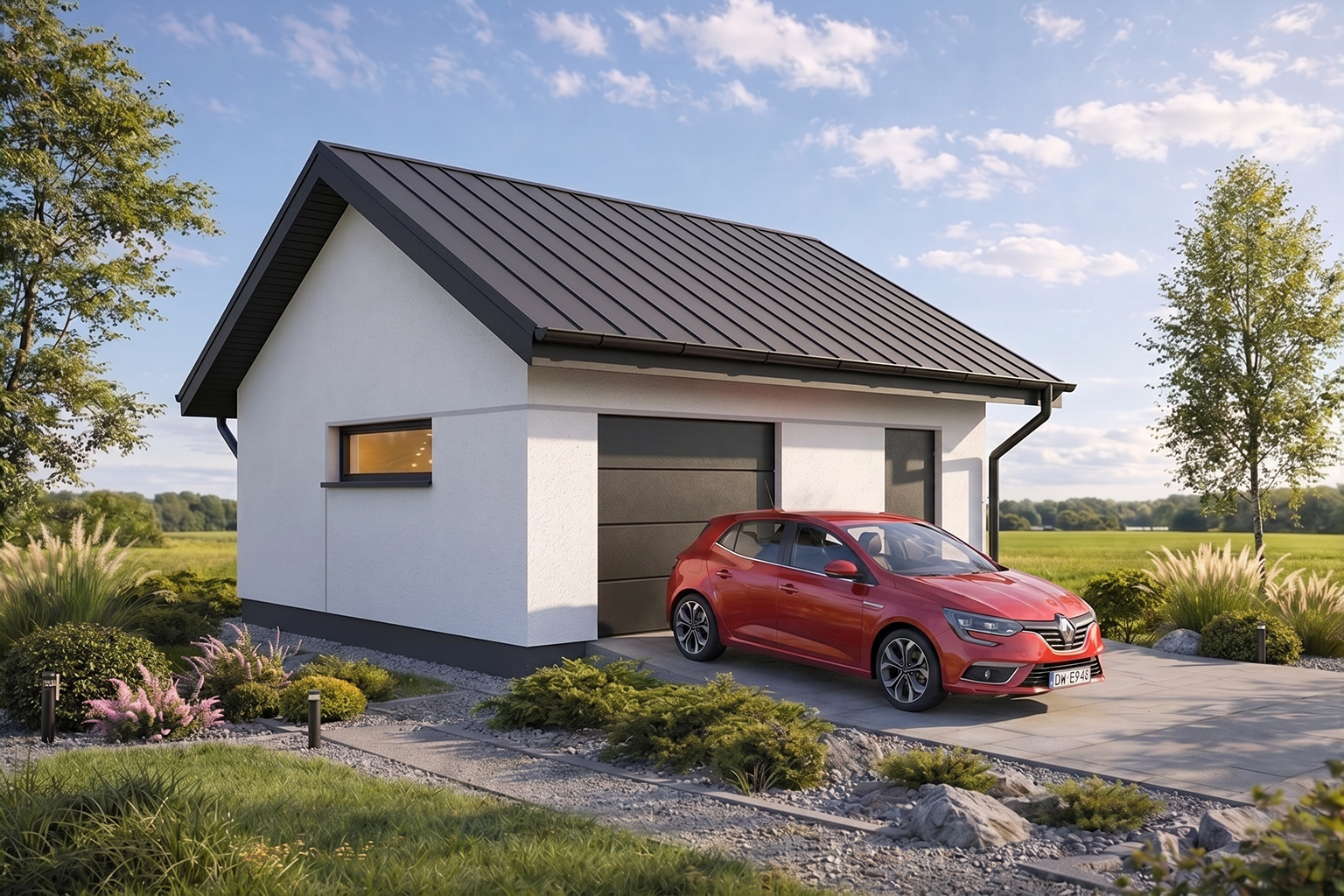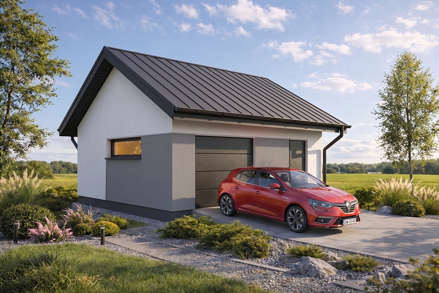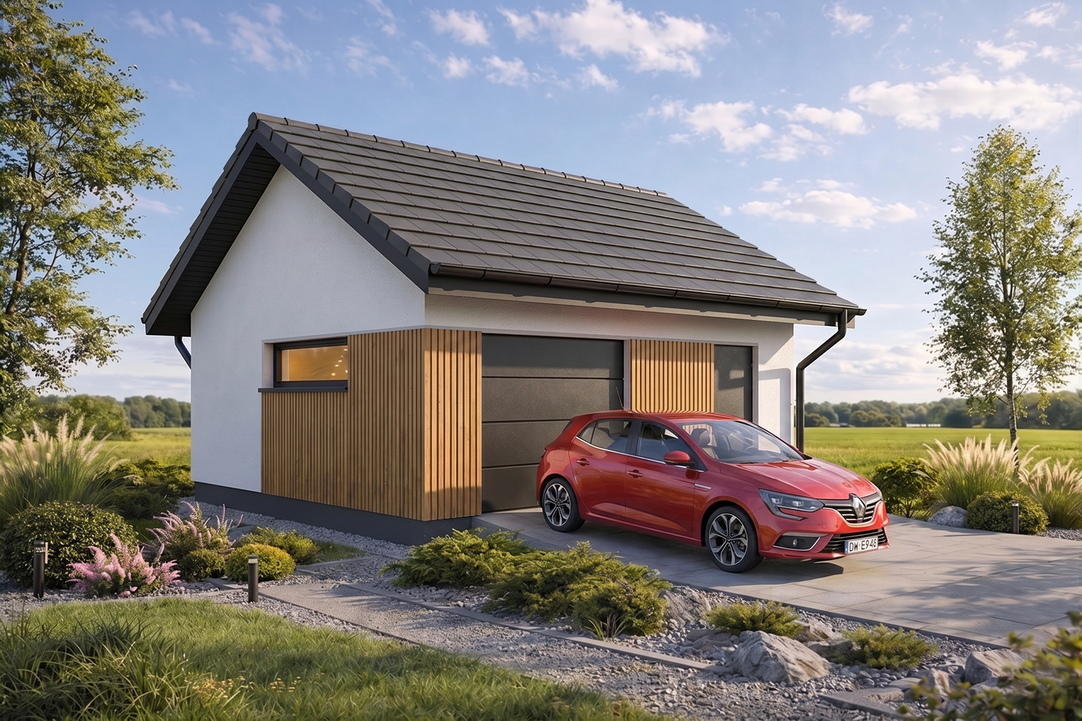 Projekt garażu z dachem dwuspadowym Monza 1.5 wyróżnia się ponadczasową architekturą, która harmonijnie współgra z nowoczesną zabudową jednorodzinną. Elewacja wykończona tynkiem może zostać ozdobiona elementami dekoracyjnymi, jak widoczne na wizualizacjach modelu Monza 1.5. Prosta forma dachu jest nie tylko tania w wykonaniu, ale również nadaje budynkowi elegancki, schludny wygląd. Stonowana kolorystyka sprawia, że garaż wolnostojący Monza 1.5 staje się estetycznym dopełnieniem otoczenia domu.