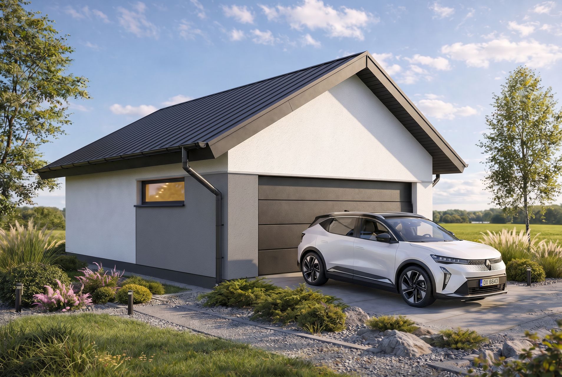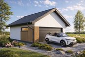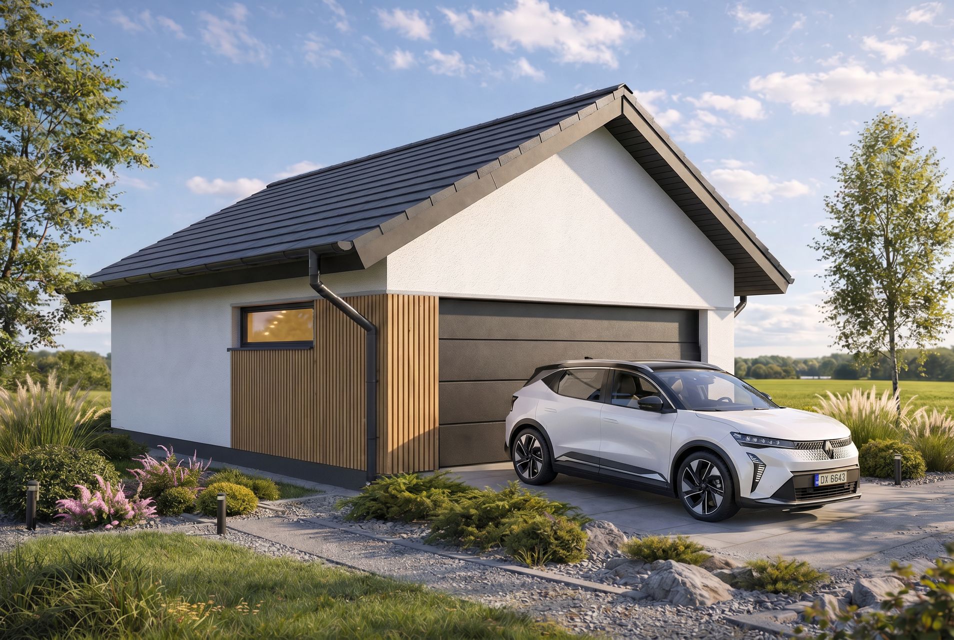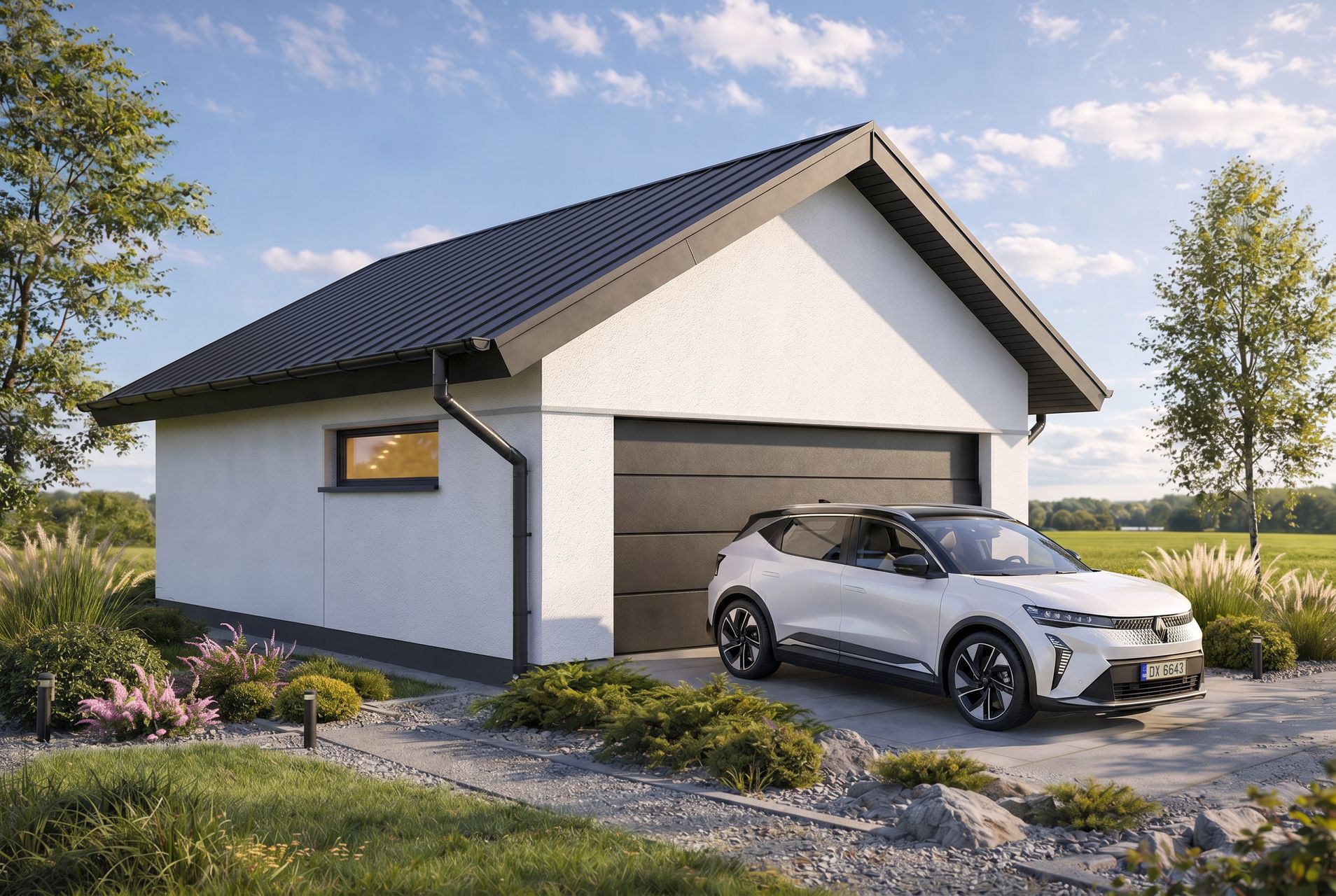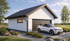 Projekt garażu z dachem dwuspadowym Monza 2.0+2 charakteryzuje się ponadczasową estetyką. Standardowe wykończenie zakłada tynk jednokolorowy, jednak elewację można wzbogacić o nowoczesne detale, takie jak lamele czy kolorowe wstawki tynku widoczne na wizualizacjach. Model Monza 2.0+2 posiada specyficzną, wydłużoną bryłę o wymiarach 6,36 x 8,74 m. Jest to rozwiązanie ułatwiające wpasowanie budynku w węższą działkę, oferując jednocześnie znaczną długość użytkową pozwalającą na umieszczenie dodatkowych funkcji za miejscami parkingowymi.