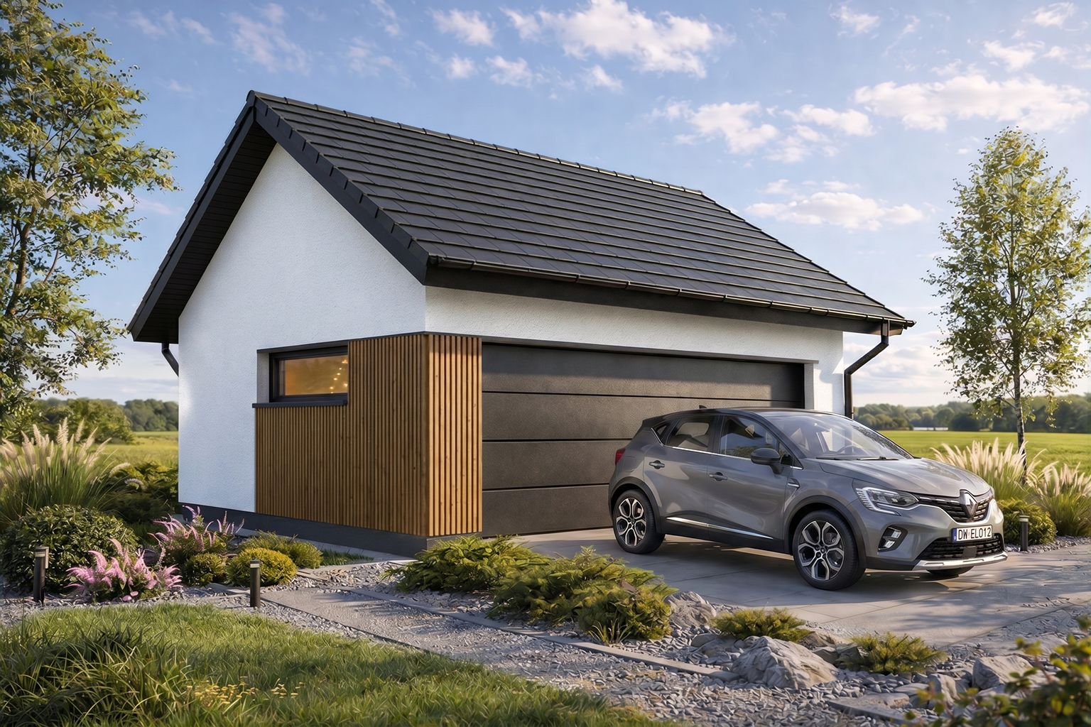 Projekt garażu z dachem dwuspadowym Monza 2.0 reprezentuje estetykę łączącą tradycję z nowoczesnym wykończeniem. Elewacja pokryta tynkiem cienkowarstwowym daje szerokie możliwości aranżacyjne. Wizualizacja sugeruje zastosowanie kolorowych detali lub dekoracyjnych okładzin, co pozwala na idealne dopasowanie wyglądu garażu do elewacji budynku mieszkalnego. Prosta konstrukcja dachu sprawia, że obiekt jest tani w wykonaniu i bardzo trwały.