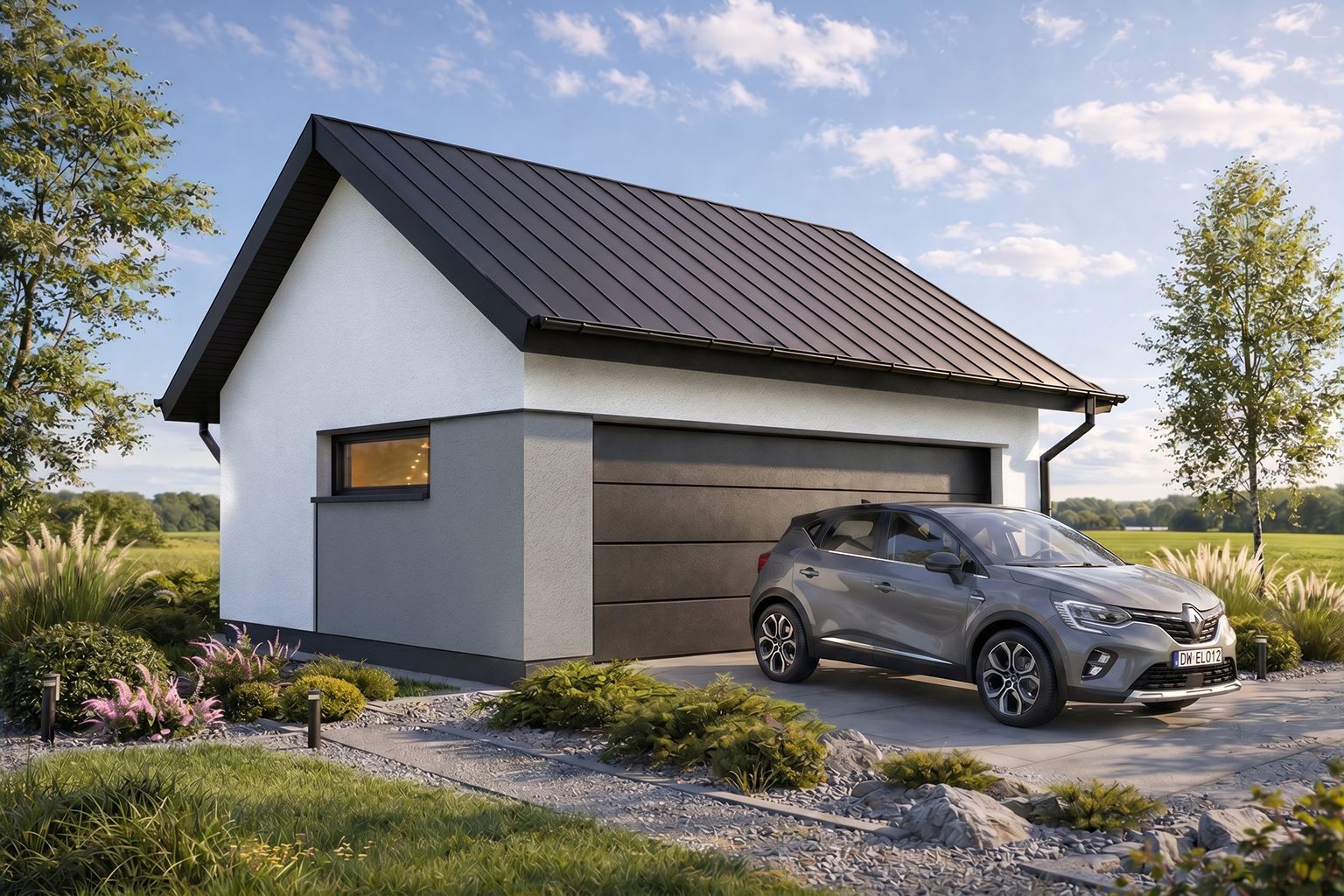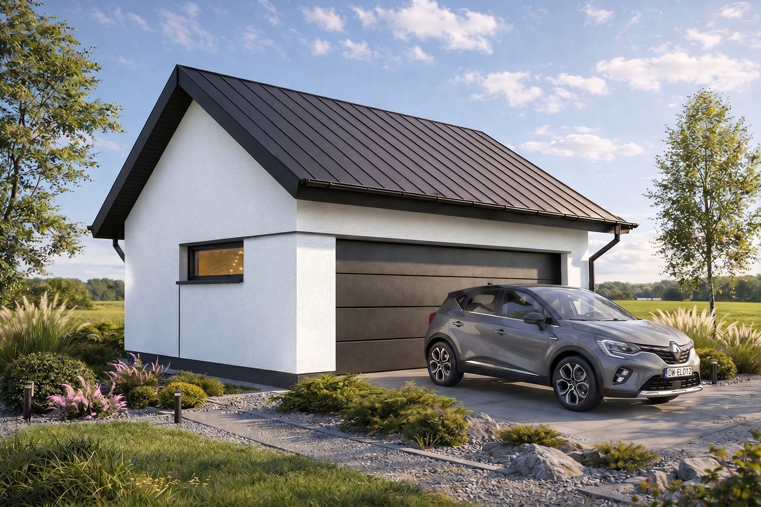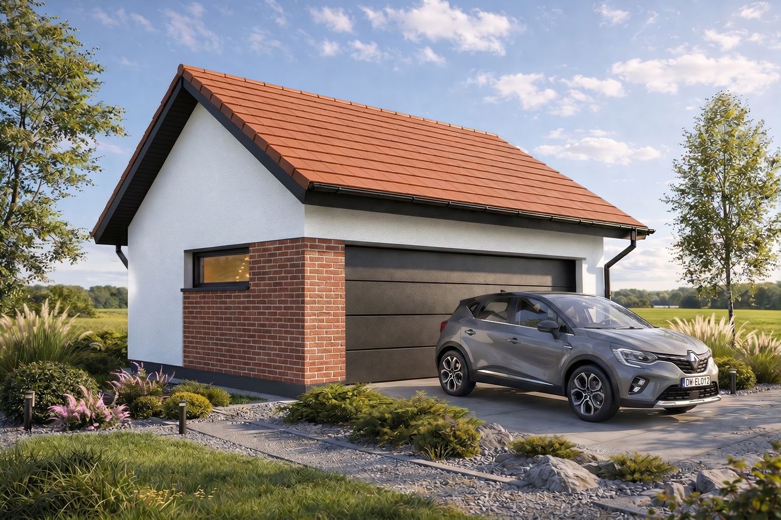 Garaż Monza 2.0 to projekt garażu dwustanowiskowego z dachem dwuspadowym, zaprojektowany w technologii murowanej. Konstrukcja oferuje dwa pełnowymiarowe miejsca postojowe bez dodatkowych pomieszczeń gospodarczych, co przekłada się na prostą bryłę i optymalizację kosztów realizacji. Budynek charakteryzuje się klasyczną formą, która pasuje do większości założeń architektonicznych.