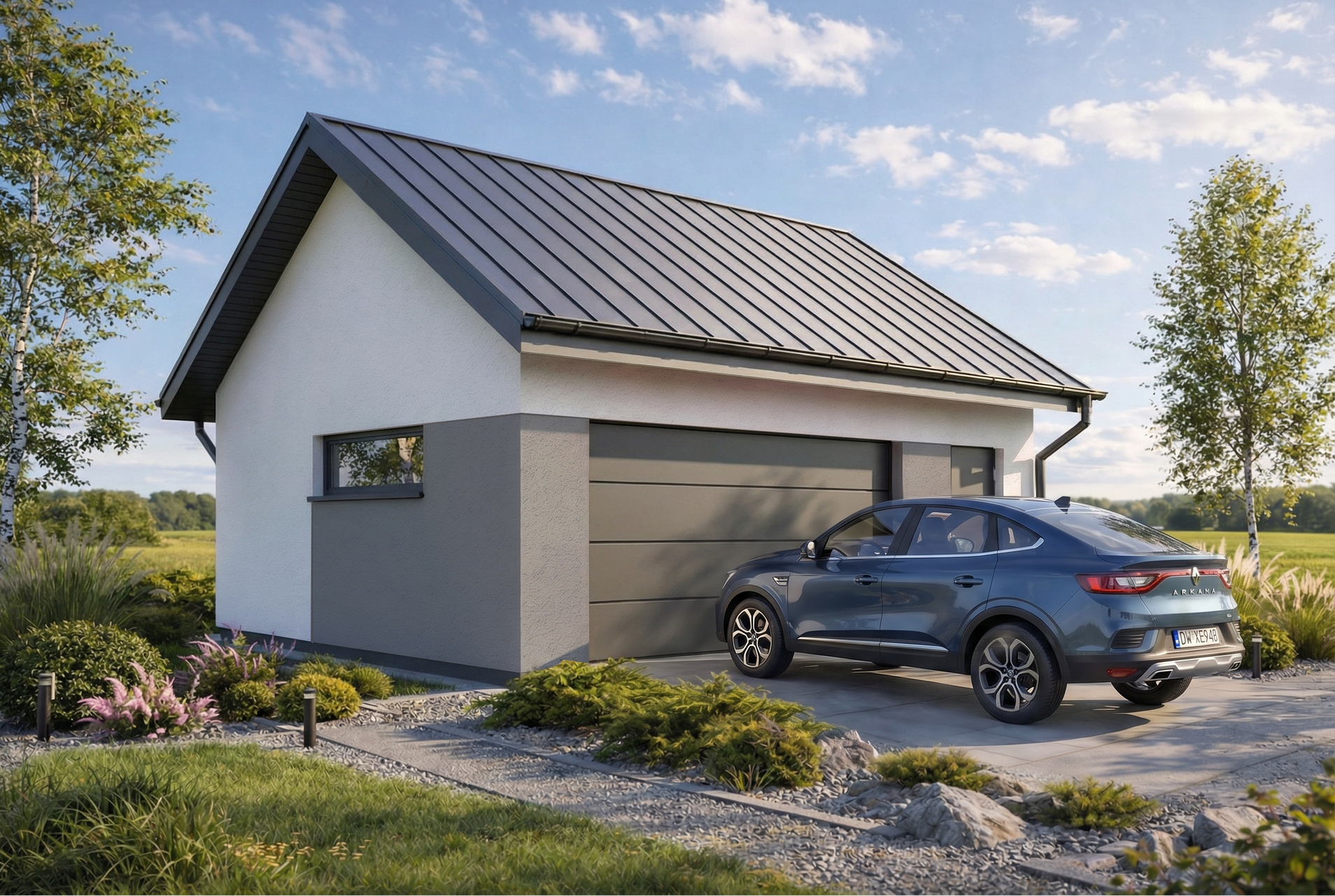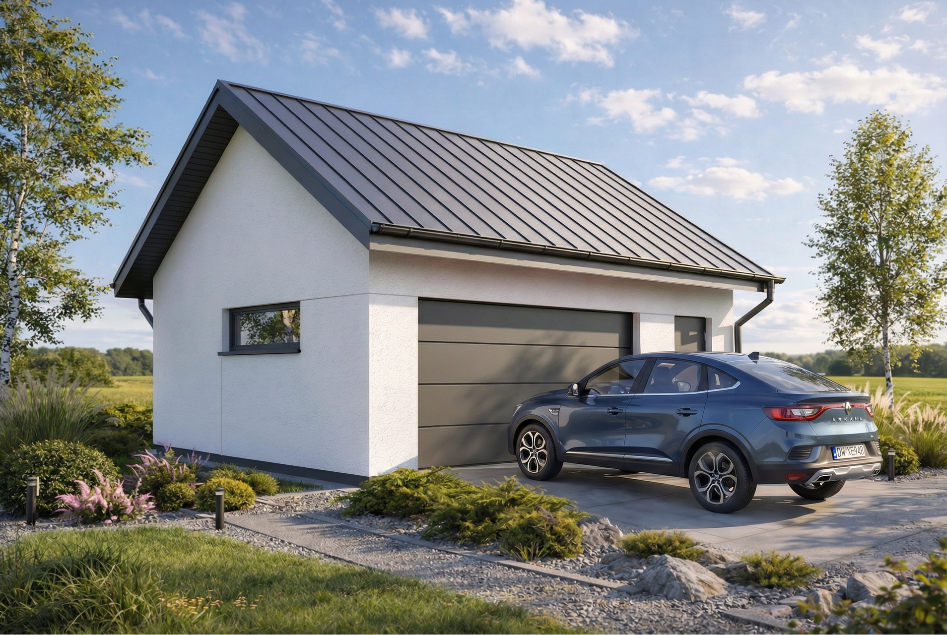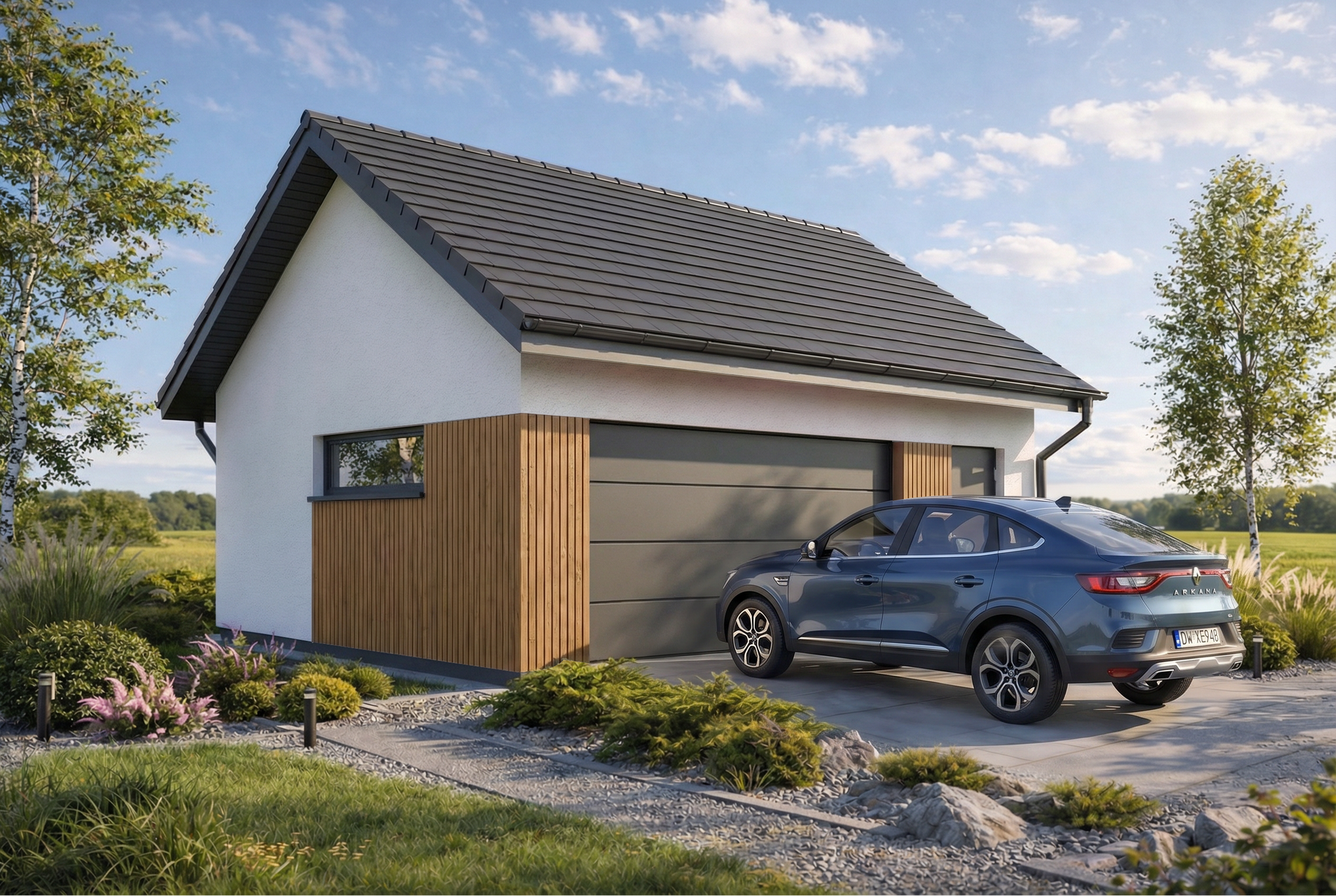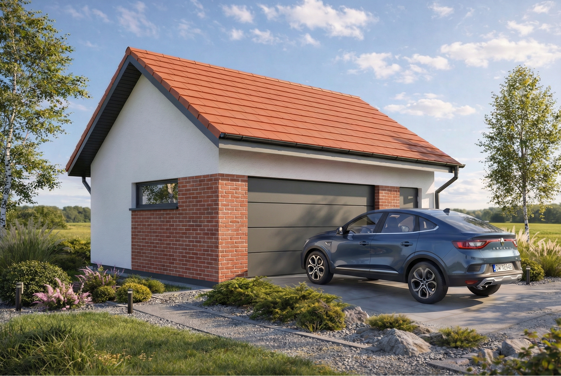 Projekt garażu z dachem dwuspadowym Monza 2.5 łączy tradycyjną, sprawdzoną formę z nowoczesnym wykończeniem elewacji. Jasny tynk został zestawiony z eleganckimi detalami, które można dowolnie personalizować, aby budynek idealnie współgrał z estetyką domu jednorodzinnego. Prosta bryła dachu jest nie tylko estetyczna, ale i ekonomiczna w realizacji, stanowiąc klasyczne dopełnienie każdej posesji.