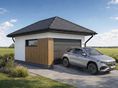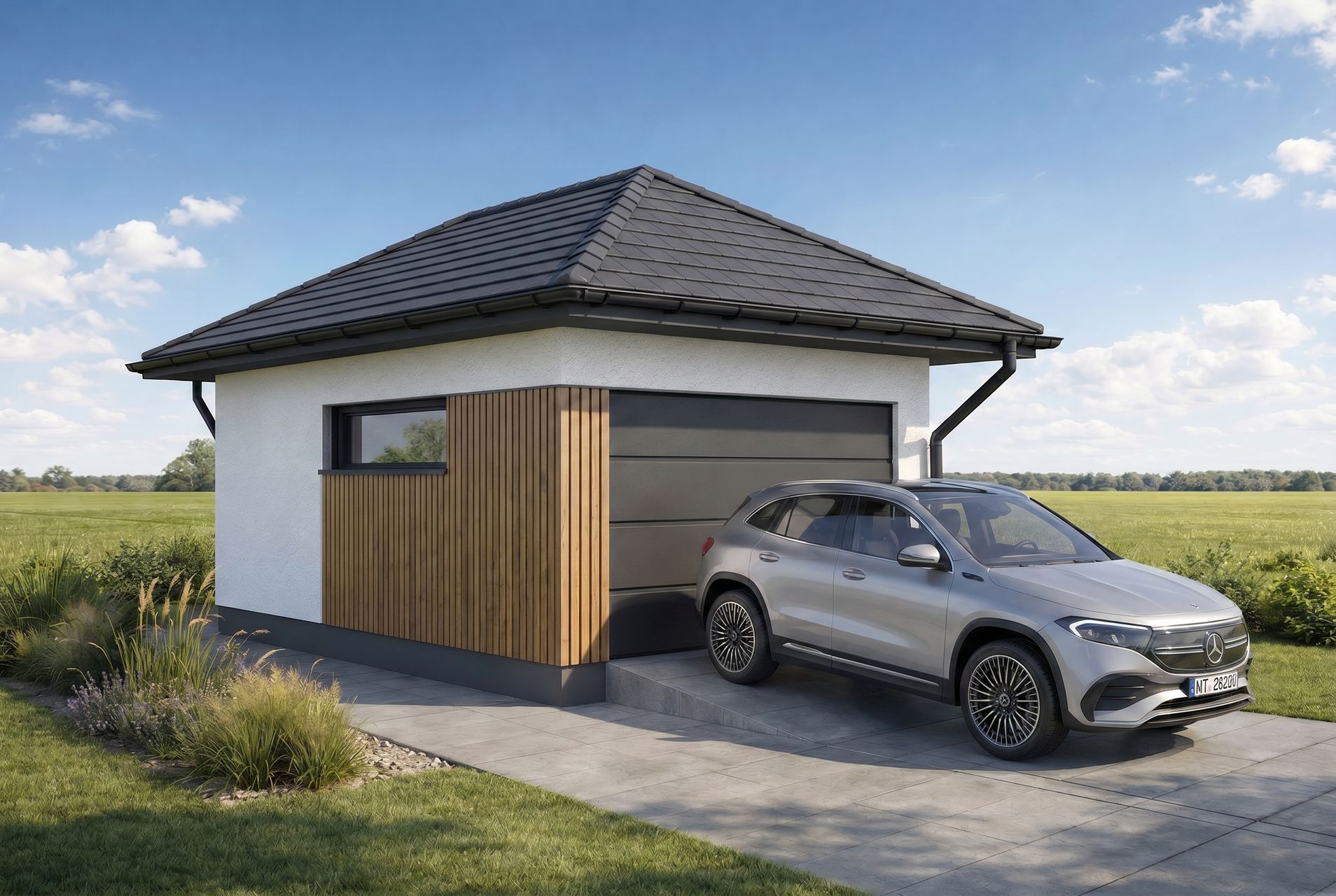 Ten projekt garażu z dachem czterospadowym wyróżnia się reprezentacyjnym wyglądem, który idealnie pasuje do domów o klasycznej i nowoczesnej architekturze. Elewacja wykończona jasnym tynkiem może zostać wzbogacona o dekoracyjne panele o strukturze drewna lub lamele, co nadaje całości luksusowego charakteru. Ciemna dachówka oraz dopasowana kolorystycznie stolarka i brama segmentowa podkreślają spójną stylistykę modelu Silverstone 1.0.