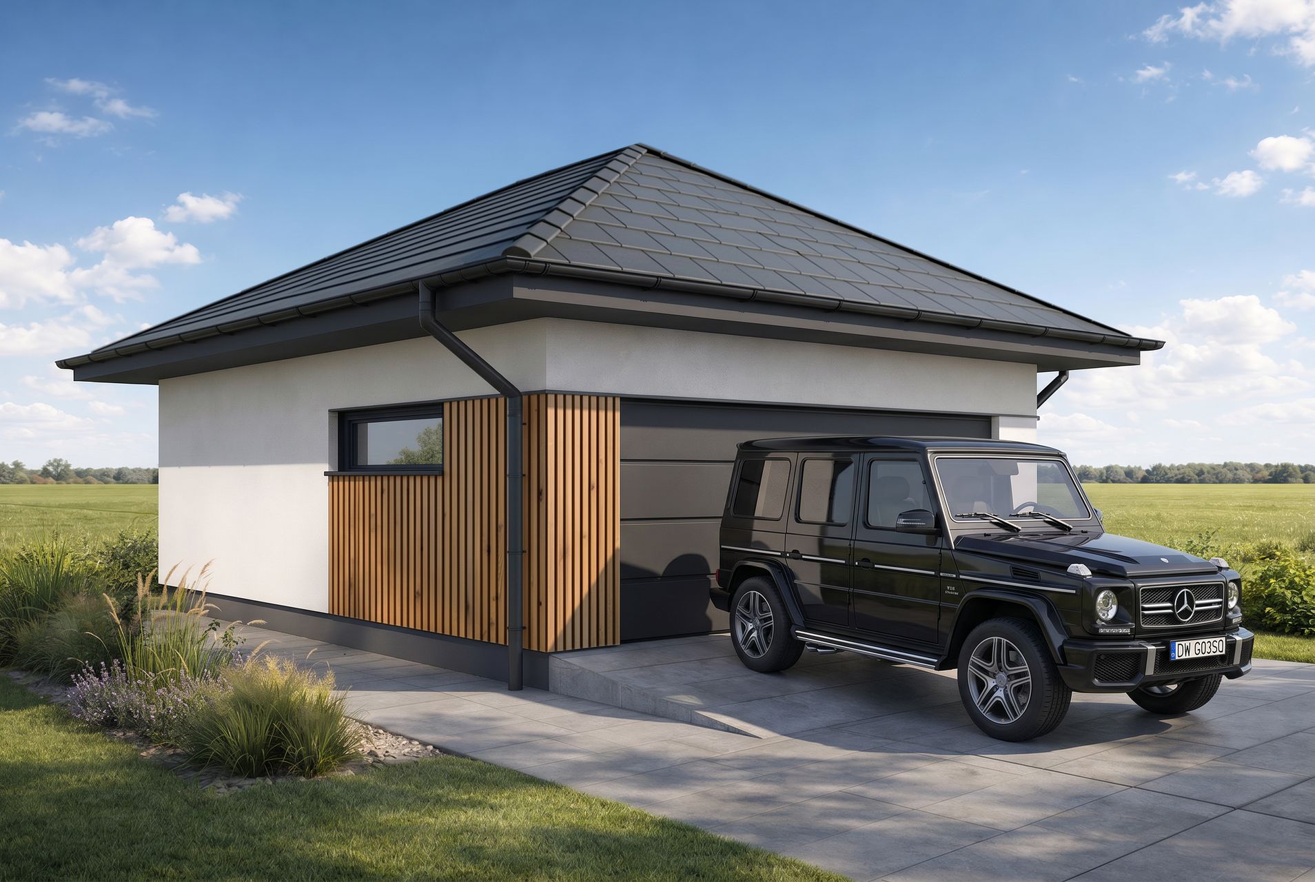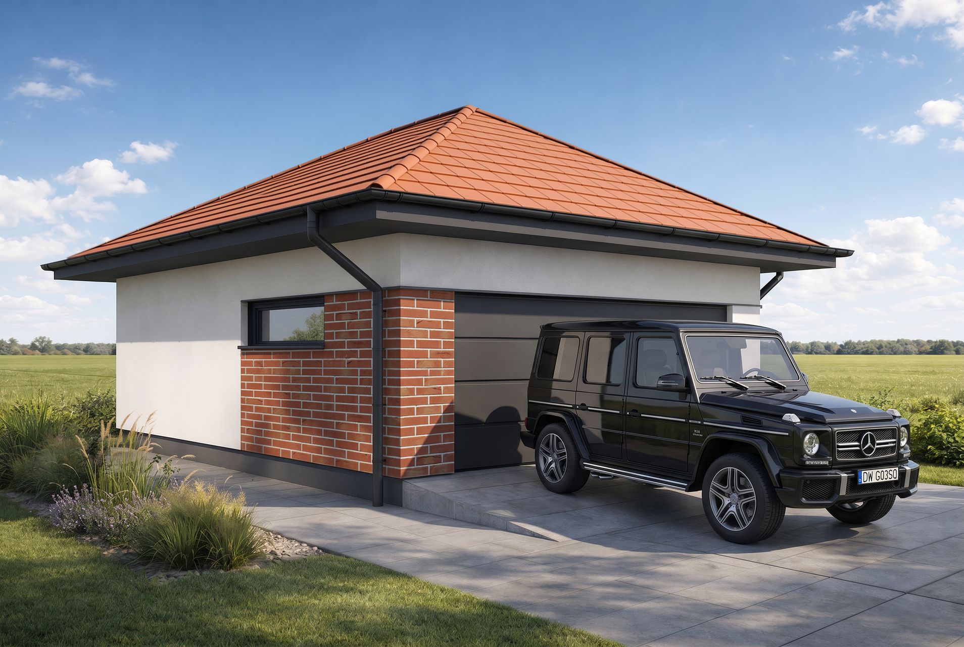 Ten projekt garażu z dachem czterospadowym prezentuje elegancką i nienachalną formę, która świetnie współgra z klasyczną architekturą domów jednorodzinnych. Jasna elewacja wykończona tynkiem została uzupełniona dekoracyjnymi elementami na narożniku, co dodaje bryle atrakcyjności. Ciemna kolorystyka szerokiej bramy segmentowej, dachu oraz stolarki drzwiowej podkreśla spójny charakter modelu Silverstone 2.0+1.
