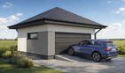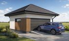 Projekt garażu z dachem czterospadowym Silverstone 2.0 wyróżnia się reprezentacyjną bryłą, która doskonale komponuje się z budynkami o podobnej architekturze. Elewacja wykończona jasnym tynkiem może być wzbogacona o dekoracyjne wstawki, które nadają klasycznej bryle nowoczesny, prestiżowy wygląd. Ciemna brama i dach harmonizują z detalami elewacyjnymi, tworząc spójną i estetyczną bryłę kompaktowego garażu.