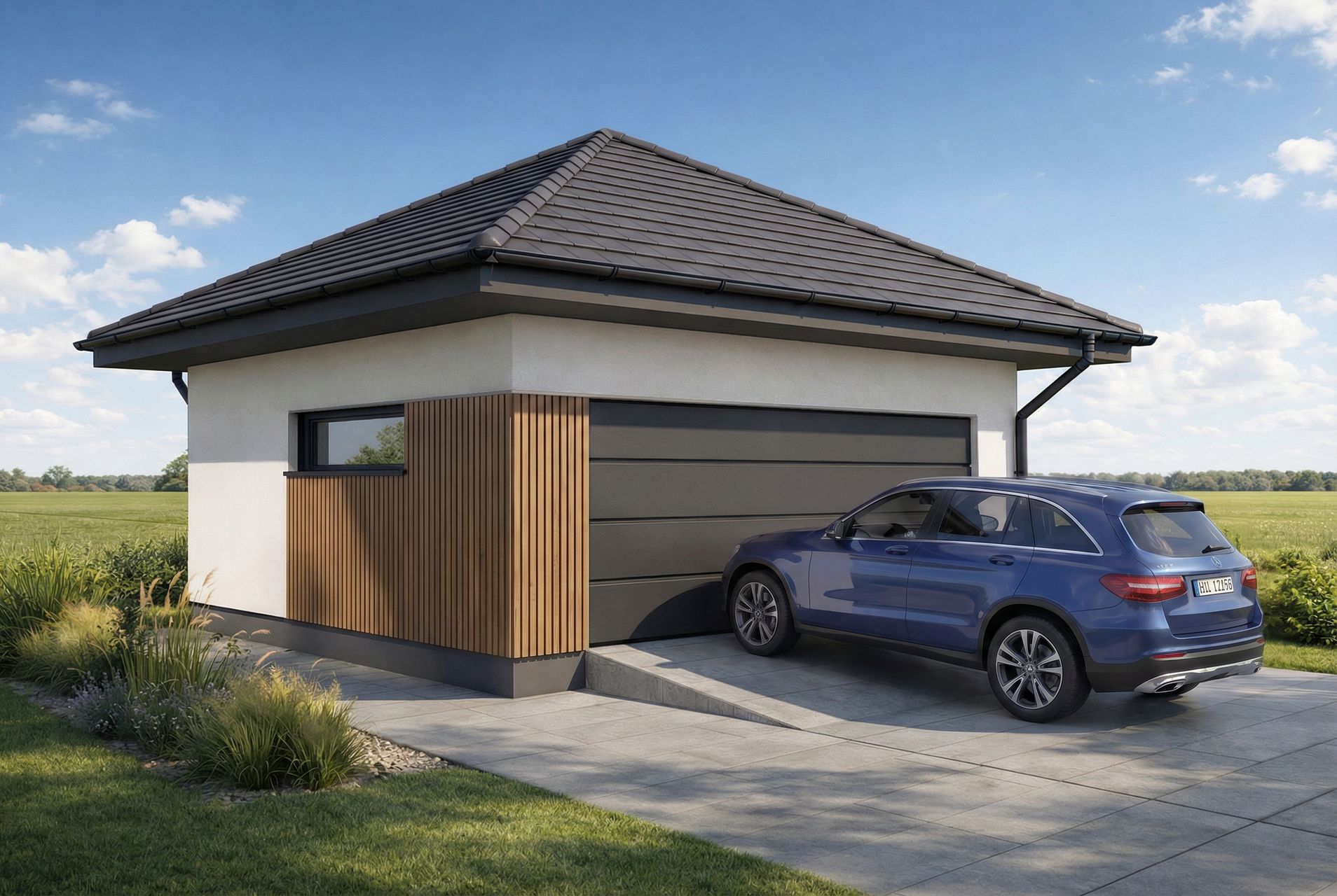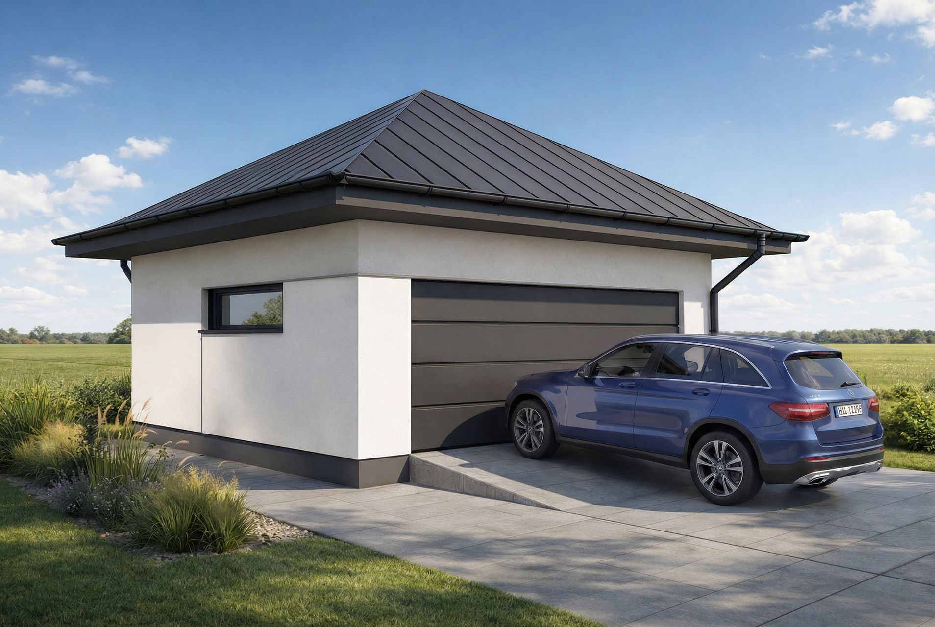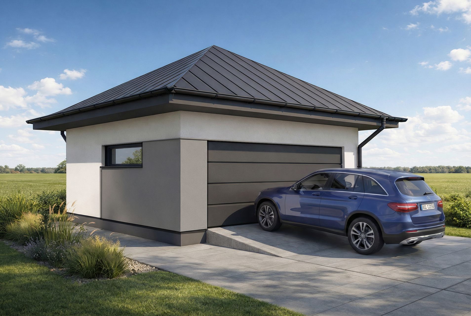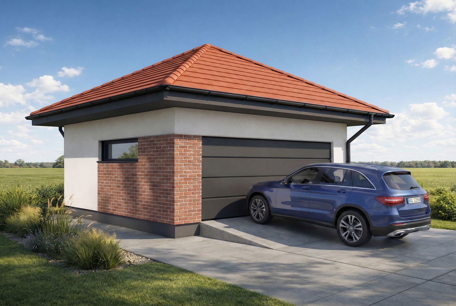 Garaż dwustanowiskowy Silverstone 2.0 to elegancki i funkcjonalny projekt garażu z dachem czterospadowym, stworzony z myślą o bezpiecznym parkowaniu dwóch pojazdów. Murowana konstrukcja o klasycznej formie i nowoczesnym wykończeniu sprawia, że budynek stanowi estetyczne dopełnienie każdej posesji.