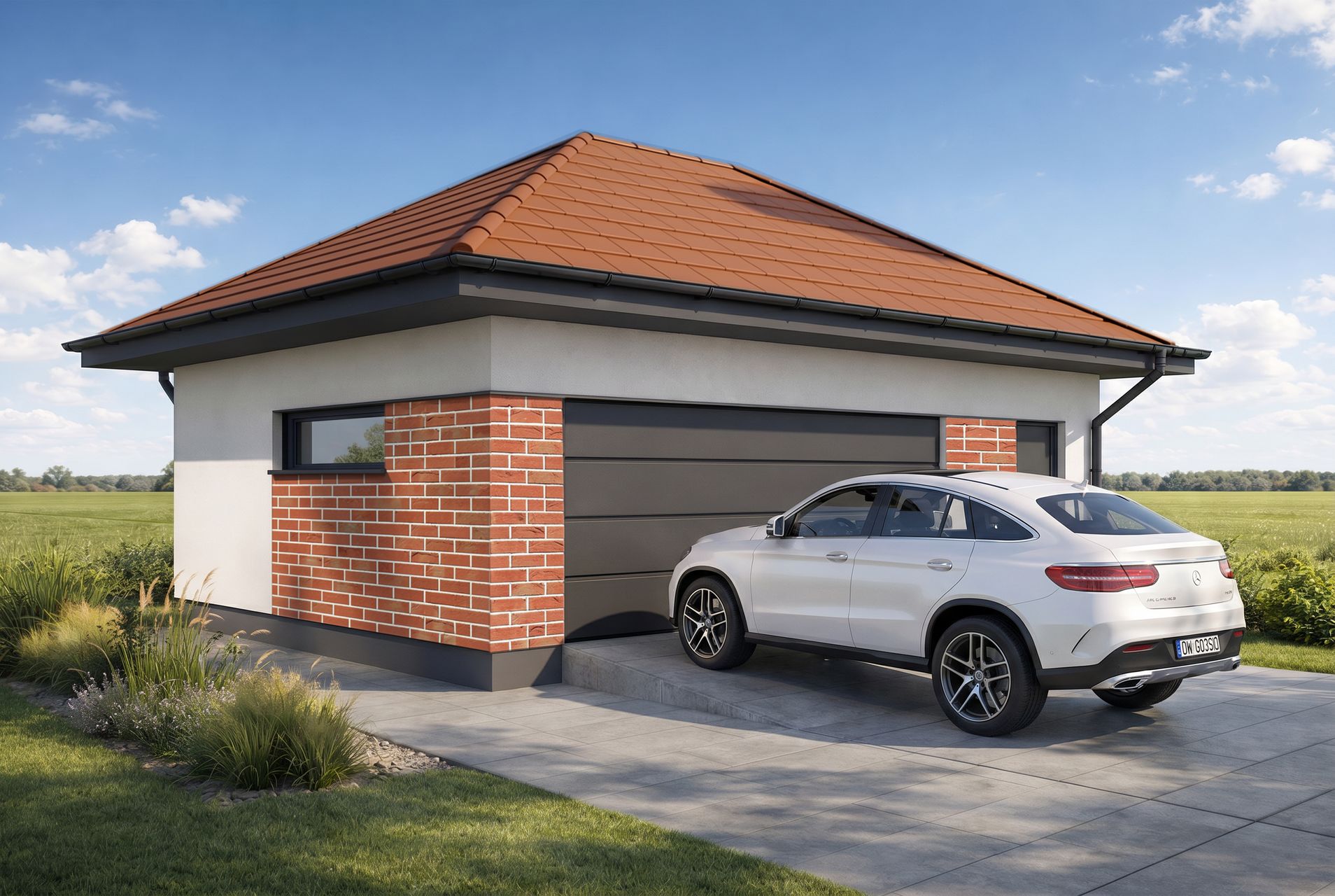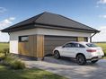 Garaż dwustanowiskowy Silverstone 2.5 to rozbudowany projekt garażu z dachem czterospadowym, który oferuje dwa wygodne miejsca postojowe oraz wydzieloną strefę gospodarczą. Solidna, murowana bryła o eleganckim wykończeniu idealnie wpisuje się w nowoczesne i klasyczne zagospodarowanie działki.