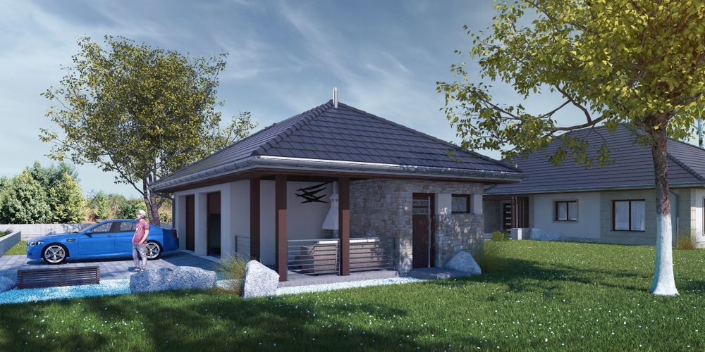 Graficzne opracowanie rzutów poglądowych widocznych na karcie projektu zostało wykonane przez Extradom.pl. Prezentowane przez Extradom.pl wizualizacje wykonane zostały przez autora projektu i należy poczytywać je jedynie za przykład i propozycję wykończenia, wizję architektoniczną autora projektu. Ostateczne wykończenie budynku może nastąpić na wiele sposobów. Szczegółowe rozwiązania zastosowane w oferowanej dokumentacji - w tym również ilość, lokalizacje i wygląd okien, drzwi, kominów - mogą w niewielkim stopniu różnić się od prezentowanej wizualizacji budynku.