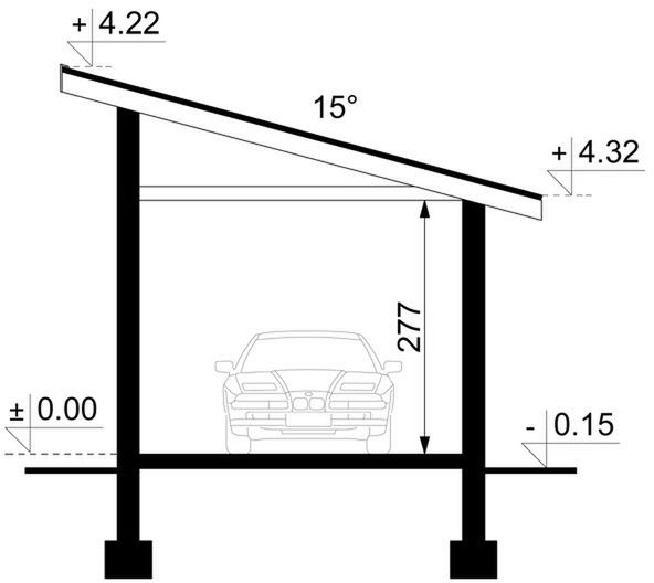 Technologia tradycyjna, ławy i ściany fundamentowe betonowe, ściany murowane z pustaków z betonu komórkowego grubości 24 cm, Dach jednospadowy o konstrukcji drewnianej, pokryty blachodachówką, tynk zewnętrzny. Brama garażowa segmentowa. Wykończenie: Ściany zewnętrzne wykończone tynkiem silikonowym w kolorze jasnym. Cokół budynku wykonany tynkiem mozaikowym. Wymiary bram garażowych: 240x225.