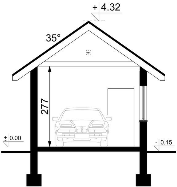 Technologia tradycyjna, ławy i ściany fundamentowe betonowe, ściany murowane z pustaków z betonu komórkowego grubości 24 cm, Dach dwuspadowy o konstrukcji drewnianej, pokryty blachodachówką, tynk zewnętrzny. Brama garażowa segmentowa. Wykończenie: Ściany zewnętrzne wykończone tynkiem silikonowym w kolorze jasnym. Cokół budynku wykonany tynkiem mozaikowym. Wymiary bram garażowych: 240x225.