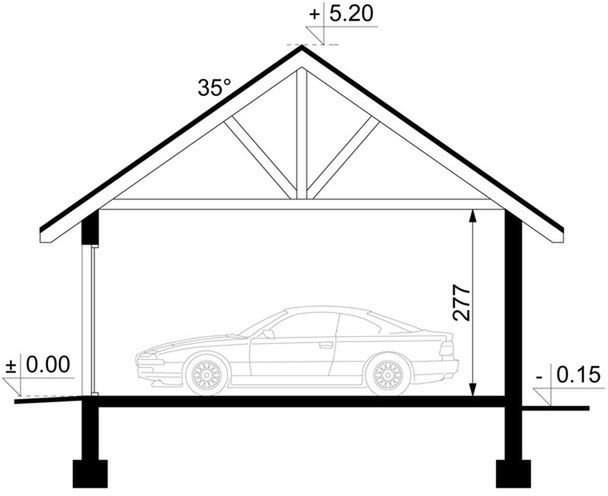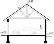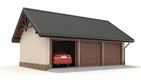 Technologia tradycyjna, ławy i ściany fundamentowe betonowe, ściany murowane z pustaków z betonu komórkowego grubości 24 cm, Dach dwuspadowy o konstrukcji drewnianej, pokryty blachodachówką, tynk zewnętrzny. Brama garażowa segmentowa. Wykończenie: Ściany zewnętrzne wykończone tynkiem silikonowym w kolorze jasnym. Cokół budynku wykonany tynkiem mozaikowym. Wymiary bram garażowych: 240x225.