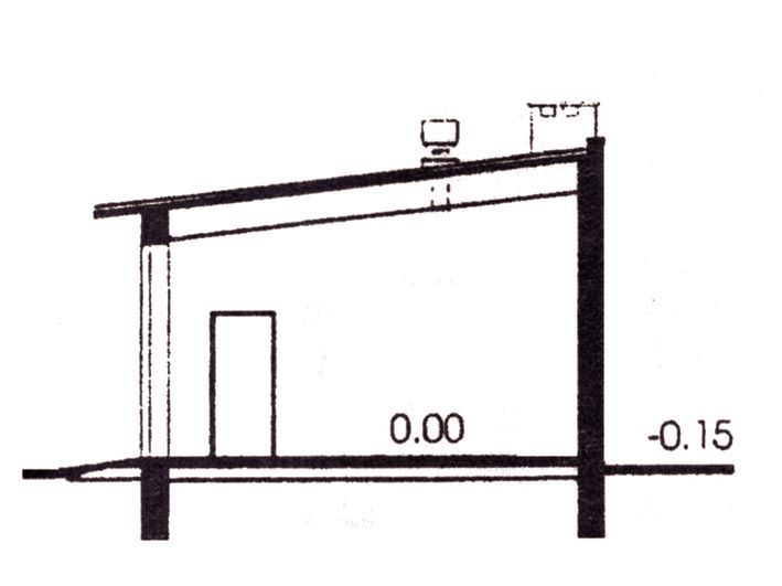 Ściany zewnętrzne: gr. 24 i 38 cm z bloczków gazobetonowych. Dach: jednospadowy o nachyleniu 6 stopni,alternatywa dwuspadowy o nachyleniu 30 stopni. Poziom kalenicy: 5,48/5,05 m od terenu