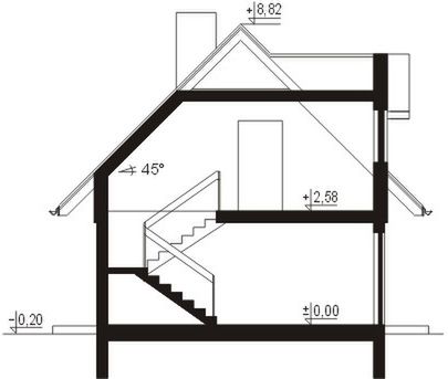 Ściany zewnętrzne: gr. 24 i 30 cm z bloczków gazobetonowych PGS. Strop: żelbetowy. Schody: żelbetowe. Dach: dwuspadowy o nachyleniu 45 stopni, więźba krokwiowo-jętkowa, krycie dachówką. Poziom kalenicy: 7 m od terenu. Dodatkowe informacje: pow. netto: 86 km k, zapotrzebowanie: mocy: 2,5 kW, energii elektr.: 750 kWh/r