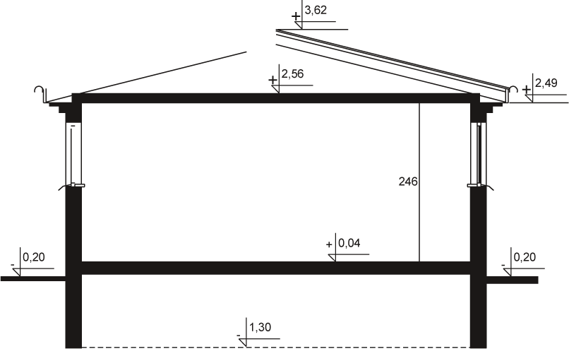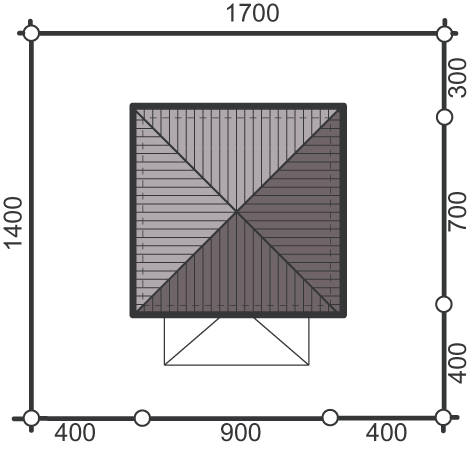 Ściany zewnętrzne: gr. 24 cm z bloczków z betonu komórkowego. Dach: czterospadowy o kącie nachylenia 14 stopni, krycie gontem bitumicznym. Poziom kalenicy: 3,92m od terenu