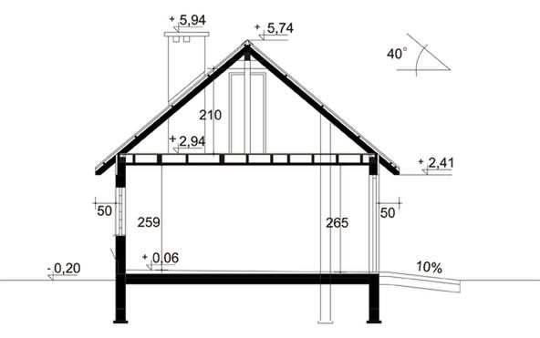 Ściany zewnętrzne: gr. 24 cm z bloczków PGS. Strop: drewniany. Dach: dwuspadowy o nachyleniu 40 stopni, krycie płytami falistymi EUROFALA. Poziom kalenicy: 5,94 m od terenu