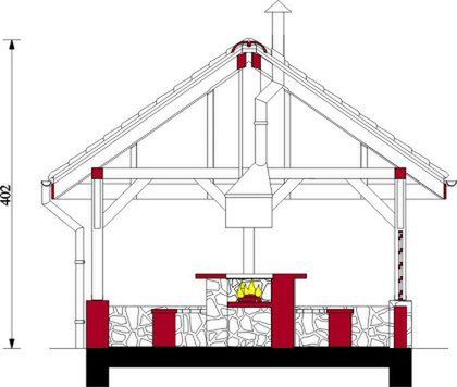 Altana konstrukcji drewnianej, przykryta prostym czterospadowym dachem. Murowana część środkowa składa się z rusztu grillowego, płyty paleniskowej i usytuowanej pod nią komory na drewno. Wokół grilla zaprojektowano okrągły blat z płyt piaskowcowych. Ławkę wokół grilla wyłożono deskami drewnianymi. Drewnianą konstrukcję przekrycia zamocowano na słupkach murowanych, będących elementem niskiego murku na rzucie kwadratu, w którego centrum znajduje się grill.