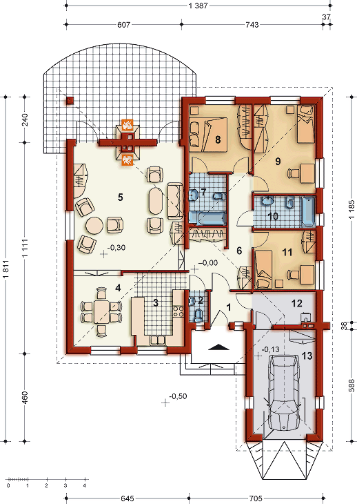 Graficzne opracowanie rzutów poglądowych widocznych na karcie projektu zostało wykonane przez Extradom.pl. Prezentowane przez Extradom.pl wizualizacje wykonane zostały przez autora projektu i należy poczytywać je jedynie za przykład i propozycję wykończenia, wizję architektoniczną autora projektu. Ostateczne wykończenie budynku może nastąpić na wiele sposobów. Szczegółowe rozwiązania zastosowane w oferowanej dokumentacji - w tym również ilość, lokalizacje i wygląd okien, drzwi, kominów - mogą w niewielkim stopniu różnić się od prezentowanej wizualizacji budynku.