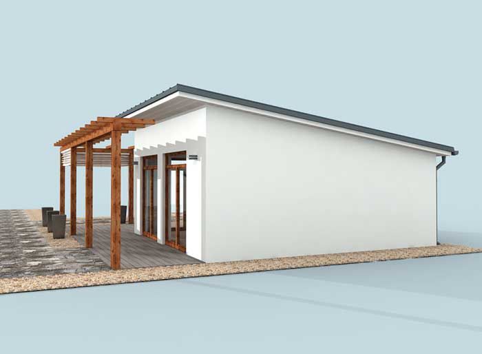 Technologia tradycyjna: ściany zewnętrzne nośne murowane grubości 30 cm. Ściany wewnętrzne działowe grubości 12 cm. Wszystkie ściany wykonane z pustaków ceramicznych "POROTHERM". Wysokość budynku 3.83 m .- dach jednospadowy 8°. Więźba dachowa drewniana.