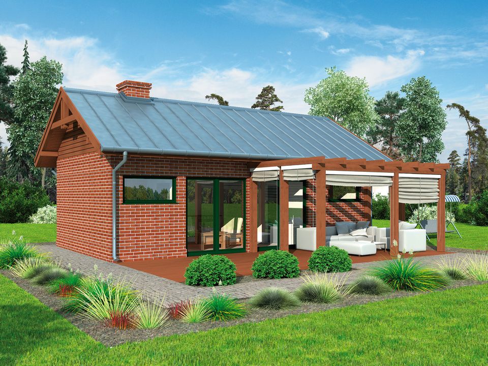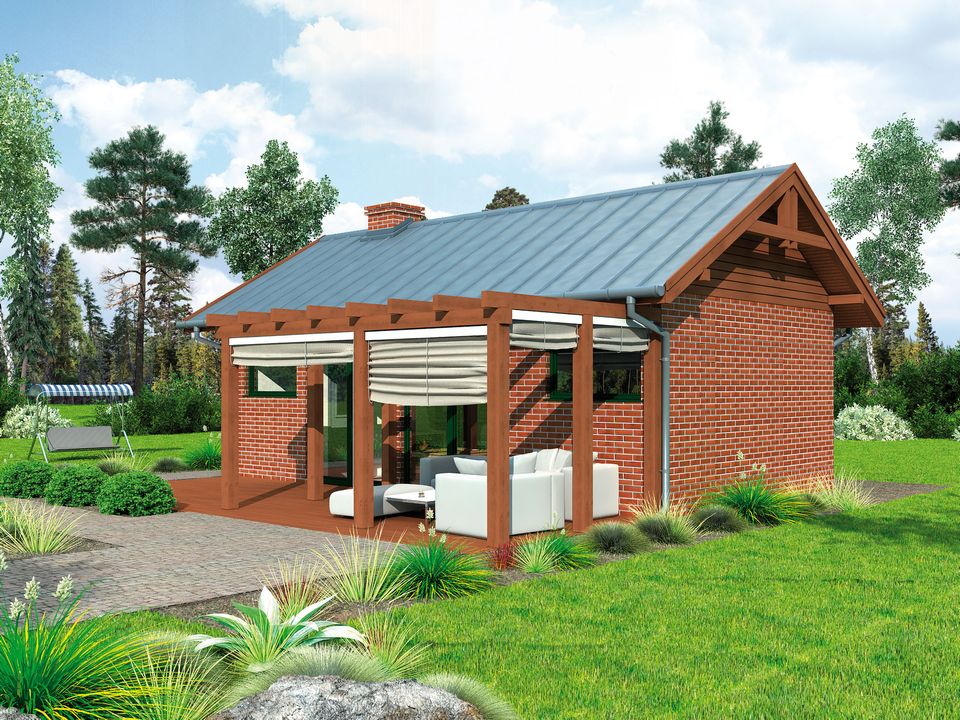 Technologia tradycyjna : Zapytaj o dostępność projektu- powierzchnia użytkowa - 36,65m2 - powierzchnia zabudowy - 45m2 - powierzchnia całkowita - 76,50m2 - ściany zewnętrzne nośne murowane grubości 25cm - wszystkie ściany wykonane z pustaków ceramicznych "POROTHERM" - wysokość budynku 5,06m - dach dwuspadowy 30° - więźba dachowa drewniana - pokrycie dachu - panele stalowe Technologia szkieletowa : Zapytaj o dostępność projektu